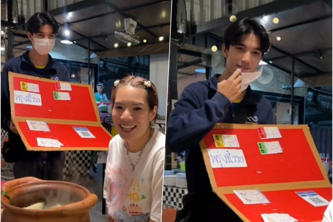 วันที่ 16 มิ.ย.67 ผู้สื่อข่าวรายงานว่า มีผู้ใช้ติ๊กต็อก @sabyebiee โพสต์คลิปสาวนั่งกินจิ้มจุ่มในร้าน แล้วมีพ่อค้าหนุ่มมขายลอตเตอรี่เดินมาชวนให้ช่วยซื้อลอตเตอรี่ ด้านสาวเกิดอาการเขินอาย พร้อมบอกว่า เป็นคนไม่เล่นหวย แต่กลับบอกว่าให้พ่อค้าถอดแมสหน้ากากออก ถ้าถูกใจจะซื้อ พอถอดออกมากรี๊ดสนั่น สรุปสาวซื้อลอตเตอรี่ และบอกว่าถ้าถูกรางวัลให้มาที่ร้านนะ