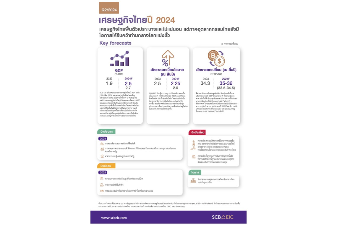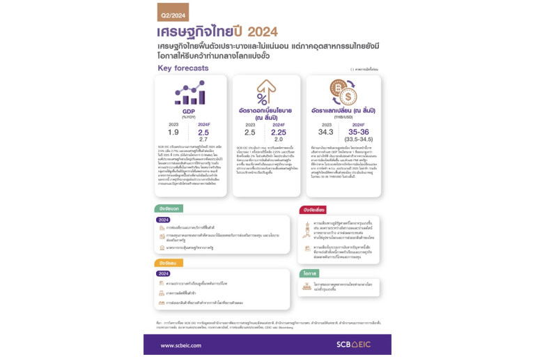 SCB EIC ประเมินเศรษฐกิจไทยปี 2567 จะทยอยฟื้นตัวไม่สูงนักที่ 2.5% โดยมีแรงส่งจากภาคบริการตามการฟื้นตัวได้ดีของนักท่องเที่ยวต่างชาติ จากการออกมาตรการดึงดูดนักท่องเที่ยวต่างชาติเพิ่มเติม ทั้งมาตรการฟรีวีซ่าและ VOA รวมถึงการกลับมาของนักท่องเที่ยวจีน อีกทั้ง การท่องเที่ยวในประเทศยังเติบโตดี โดยจังหวัดเมืองรองมีแนวโน้มได้รับความสนใจมากขึ้นจากมาตรการกระตุ้นการท่องเที่ยวของภาครัฐ ขณะที่องค์ประกอบของเศรษฐกิจไทยยังมีแรงกดดันจาก (1) การส่งออกสินค้าที่จะขยายตัวจำกัดส่วนหนึ่งเพราะการส่งออกไทยเริ่มฟื้นตัวไม่สอดคล้องกับปริมาณการค้าโลกมากขึ้น โดยเฉพาะสินค้ากลุ่มเหล็ก ผลไม้ และ HDD ที่จะหดตัวในปีนี้ (2) ภาคการผลิตที่จะฟื้นตัวอย่างค่อยเป็นค่อยไปโดยมีแรงกดดันทั้งปัจจัยภายนอกจากสินค้าจีนที่เข้ามาตีตลาดเนื่องจากจีนมีปัญหา Overcapacity ในประเทศ รวมถึงปัจจัยภายในจากอุปสงค์ในประเทศที่เริ่มมีสัญญาณแผ่วลง และ (3) การลงทุนภาครัฐที่แม้จะกลับมาเร่งตัวจากการเร่งรัดเบิกจ่ายหลัง พ.ร.บ. งบประมาณปี 2567 ล่าช้ากว่าครึ่งปี แต่จะไม่สามารถชดเชยการหดตัวรุนแรงในช่วง 4 เดือนแรกของปีนี้ได้ สำหรับในปี 2568 เศรษฐกิจไทยจะฟื้นตัวต่อเนื่องที่ 2.9% ส่วนหนึ่งจากการฟื้นตัวของการลงทุนภาคเอกชนและการเบิกจ่ายภาครัฐที่กลับมาเป็นปกติ