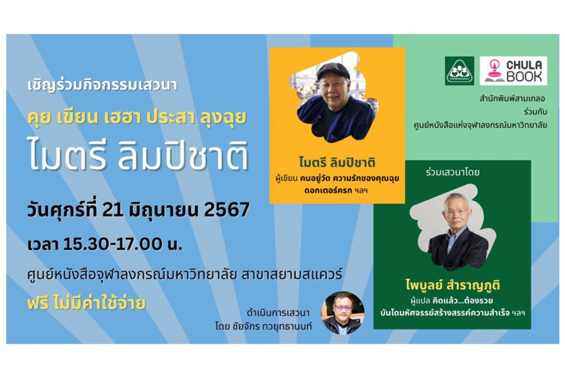 ในวันศุกร์ที่ 21 มิถุนายน 2567 เวลา 15.30 - 17.00 น. ณ ศูนย์หนังสือจุฬาฯ สาขาสยามสแควร์ อาคารวิทยกิตติ์ ชั้น G รับชมไลฟ์ได้ทางเฟสบุ๊คแฟนเพจ Chulabook สอบถามรายละเอียดได้ที่ แผนกสื่อสารองค์กร ศูนย์หนังสือจุฬาฯ โทร. 0-2218-9893-5