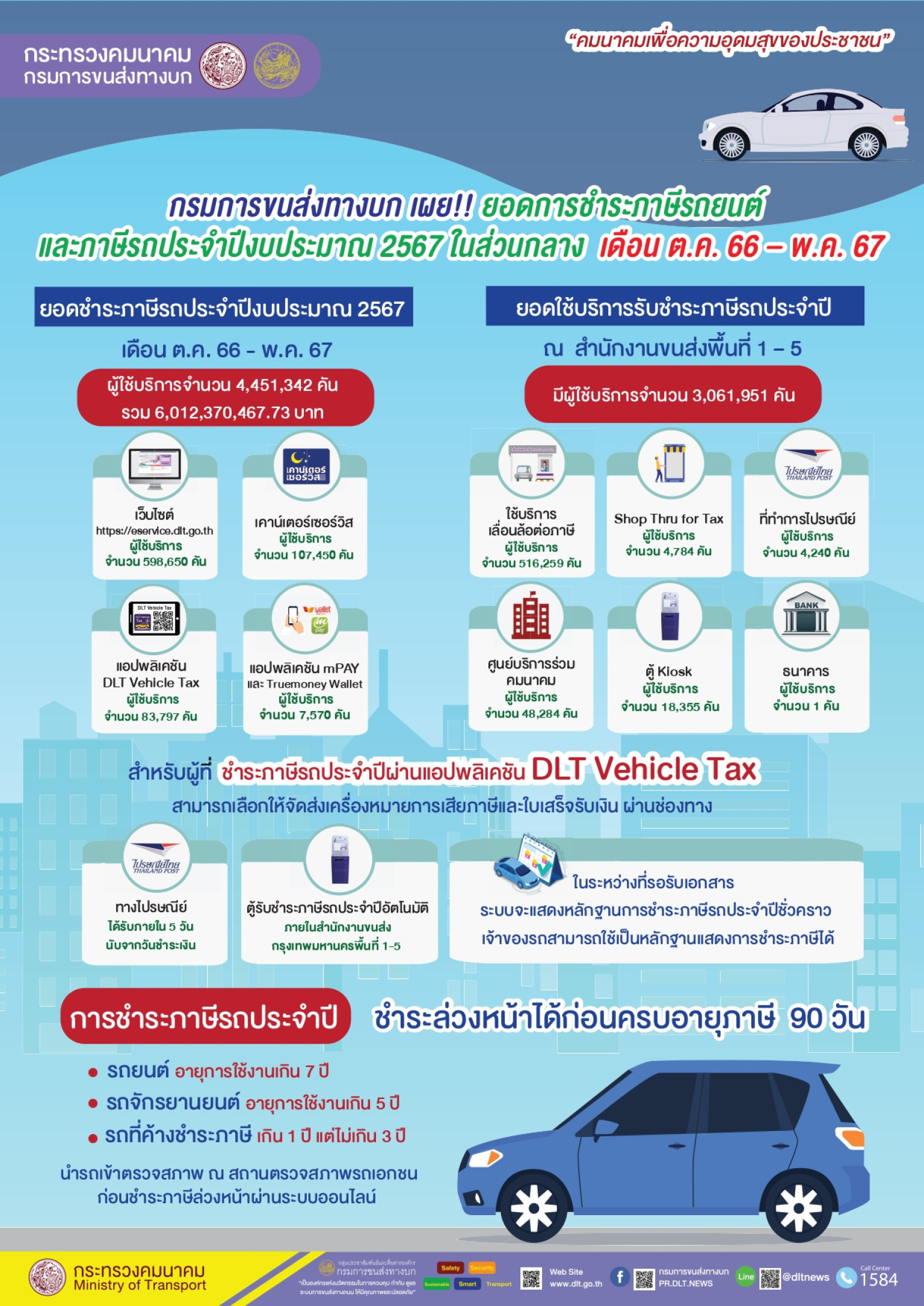 นายเสกสม อัครพันธุ์ รองอธิบดีกรมการขนส่งทางบก และโฆษกกรมการขนส่งทางบก กล่าวว่า ปัจจุบันกรมการขนส่งทางบก มีช่องทางในการให้บริการประชาชนสำหรับการชำระภาษีรถยนต์และรถจักรยานยนต์หลายช่องทาง โดยมีช่องทางการชำระภาษีออนไลน์ ซึ่งได้รับความนิยมจากประชาชนเพิ่มมากขึ้น เนื่องจากเป็นช่องทางที่มีความสะดวก และไม่ต้องเดินทางมาที่สำนักงานขนส่ง อยู่ที่ไหนก็สามารถชำระภาษีได้ สำหรับยอดผู้ชำระภาษีรถตามกฎหมายว่าด้วยรถยนต์ ประจำปีงบประมาณ พ.ศ. 2567 ระหว่างเดือน ต.ค. 66 - พ.ค. 67 กรมการขนส่งทางบกสามารถจัดเก็บภาษีรถในส่วนกลาง(สำนักงานขนส่งกรุงเทพพื้นที่ 1 – 5 ) ได้จำนวนทั้งสิ้น 4,451,342 คัน รวมทั้งสิ้นเป็นเงิน 6,012,370,467.73 บาท โดยแบ่งออกเป็นผู้ใช้บริการชำระภาษีรถออนไลน์บนแอปพลิเคชัน DLT Vehicle Tax จำนวน 83,797 คัน เว็บไซต์ https://eservice.dlt.go.th จำนวน 598,650 คัน เคาน์เตอร์เซอร์วิส จำนวน 107,450 คัน และผ่านโทรศัพท์มือถือ (True move) 7,570 คัน ในส่วนการใช้บริการรับชำระภาษีรถประจำปี ณ สำนักงานขนส่งพื้นที่ 1 – 5 มีผู้ใช้บริการจำนวน 3,061,951 คัน การใช้บริการเลื่อนล้อต่อภาษี (Drive Thru for Tax) จำนวน 516,259 คัน Shop Thru for Tax จำนวน 4,784 คัน ที่ทำการไปรษณีย์ จำนวน 4,240 คัน ชำระผ่านศูนย์บริการร่วมคมนาคม 48,284 คัน ตู้ Kiosk จำนวน 18,355 คัน และผ่านธนาคารจำนวน 1 คัน