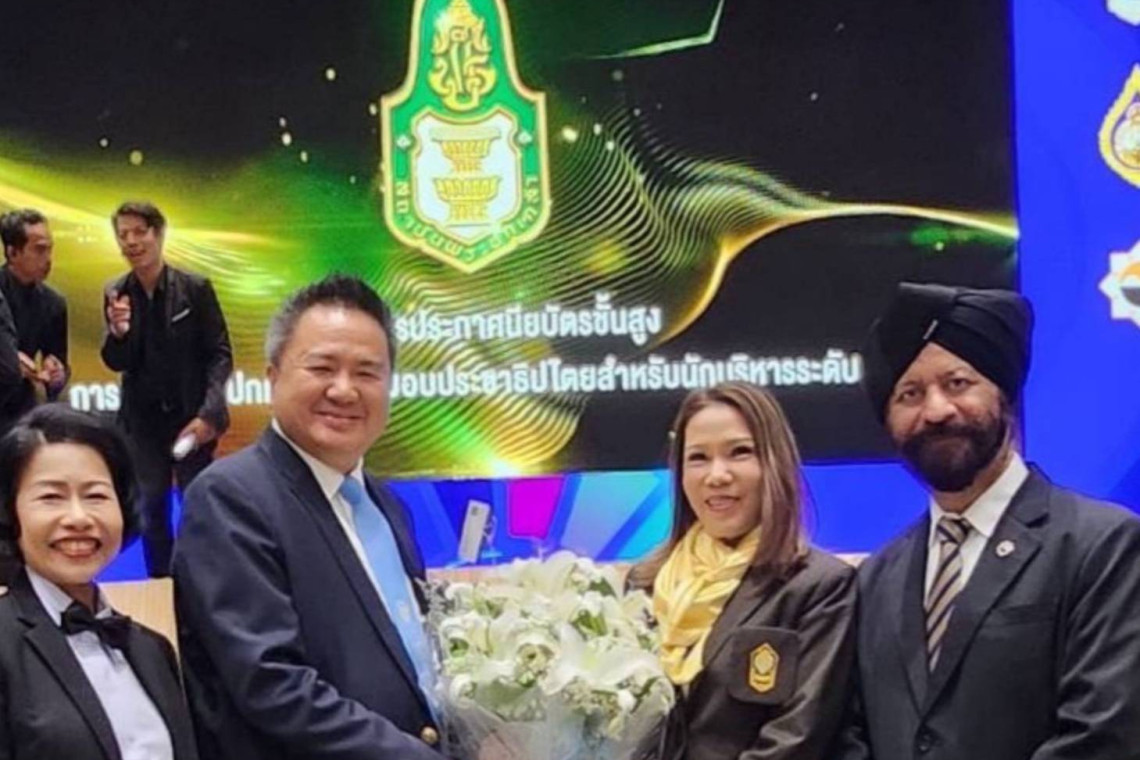 วันที่ 19 มิถุนายน 2567 นางสาวอรรฆยา พลตื้อ กรรมการผู้จัดการ บริษัท วิชั่นกลาส แอน ดอร์ เทรียล และบริษัท วิชั่นกลาส อินดรัสทรีส์ จำกัด ตัวแทนนักศึกษาหลักสูตรการพัฒนาการเมืองและการเลือกตั้งระดับสูง รุ่นที่ 14 (พตส. 14) มอบช่อดอกไม้ให้แด่ นายวันฉัตร สุวรรณกิตติ รองเลขาธิการสภาพัฒนาการเศรษฐกิจและสังคมแห่งชาติ และ นางปัทมา วงษ์ถ้วยทอง รองประธานกรรมการ บริษัท โซลาร์ตรอน จำกัด (มหาชน) ในโอกาสเป็นตัวแทนขึ้นเสวนาในงานสัมมนาวิชาการหลักสูตรผู้บริหารระดับสูง 6 สถาบัน ครั้งที่ 13 ณ วิทยาลัยป้องกันราชอาณาจักร อาคารอเนกประสงค์ สถาบันวิชาการป้องกันประเทศ