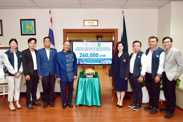 ดร.จงรัก วัชรินทร์รัตน์ อธิการบดีมหาวิทยาลัยเกษตรศาสตร์ รับมอบเงินบริจาคเพื่อสนับสนุนการสร้างคณะแพทยศาสตร์และโรงพยาบาลมหาวิทยาลัยเกษตรศาสตร์ จากหลักสูตรประกาศนียบัตรผู้นำระดับสูงด้านธุรกิจที่ยั่งยืน (KU CARE) รุ่นที่ 1 และบริษัทธรรมสรณ์ จำกัด เป็นเงิน จำนวน 260,000 บาท ณ อาคารสารนิเทศ 50 ปี มหาวิทยาลัยเกษตรศาสตร์