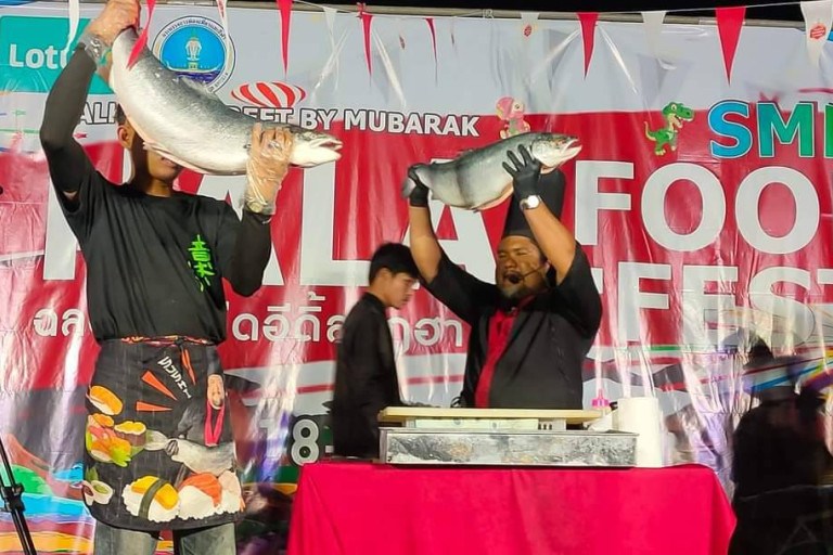 ภาคธุรกิจสมาพันธ์ sme ไทยจังหวัดสตูล ทำเก๋เปิดงานSME HALAL FOOD FEST 2024 ครั้งที่ 1 อย่างยิ่งใหญ่ ด้วยการนำปลาแซลมอนจากแอตแลนติกเหนือ ขนาดตัวละ 9 กิโลกรัมจำนวน 2 ตัวมูลค่า 10,000 บาท มาโชว์ ให้ผู้ร่วมงานและนักท่องเที่ยวได้ชิมจากฝีมือเชฟ มืออาชีพภายในงาน
