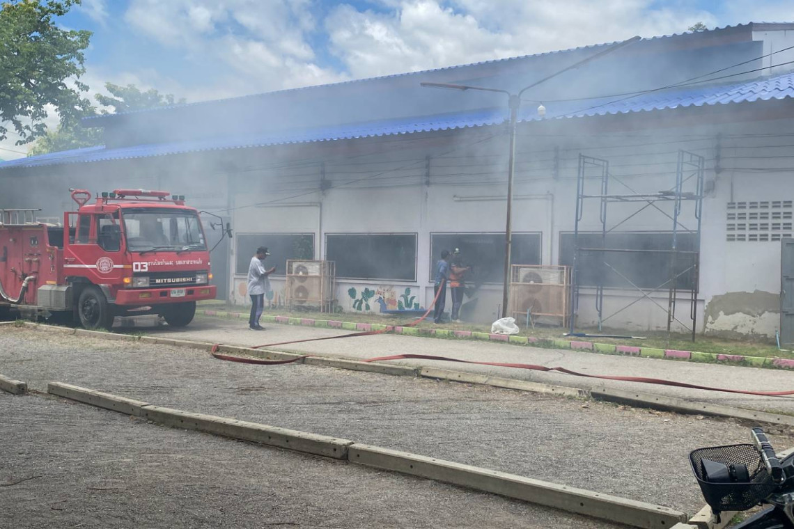 ที่เกิดเหตุเป็นอาคารชั้นเดียวด้านในเป็นห้องสมุดและห้องประชุมเล็ก ต้นเพลิงลุกไหม้มาจากห้องสมุดที่ถูกปิดอยู่ เจ้าหน้าที่ต้องใช้อุปกรณ์ตัดแม่กุญแจ และใช้เหล็กทุบหน้าต่าง เพื่อทำการฉีดน้ำสกัดเพลิงได้สะดวกขึ้น ใช้เวลาประมาณ 20 นาที เพลิงจึงสงบลง ตรวจสอบด้านในห้องสมุดพบอุปกรณ์การเรียน โต๊ะ เก้าอี้ หนังสือ ได้รับความเสียหายทั้งหมด แต่ยังประเมินค่าไม่ได้