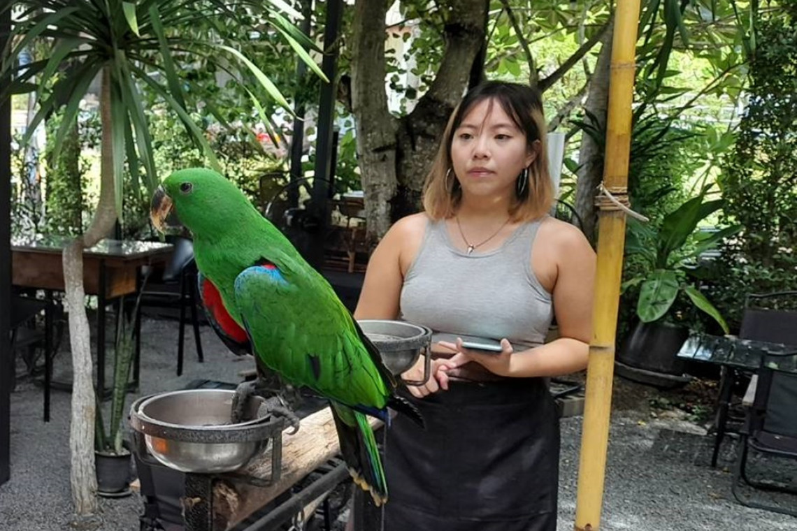 โดยได้พบกับ น.ส.กมลา ชีพสมุทร เจ้าของร้านในวัย 23 ปี ได้พาผู้สื่อข่าวเดินเยี่ยมชมจุดต่างๆในร้านพร้อมกับแนะจุดขายไฮไลท์ของร้าน นั่นคือนกแก้วสายพันธ์ต่างๆอาทิ นกแก้ว บลูแอนด์โกลด์ มาคอว์ แอฟริกัน เกรย์ ที่ฉลาดและพูดได้หลายพันคำ อีเล็คตัส เลิฟเบิร์ด เป็นต้น นอกจากนี้ ยังมีมุมไว้ให้ฝึกสมาธิ ทั้งมุมวาดภาพ มุมร้อยลูกปัด หรือจะมุมที่นั่งพักผ่อนจิบกาแฟ ทั้งในและนอกห้องแอร์ ให้ได้เลือกพักผ่อนกันแบบชิวล์ๆ
