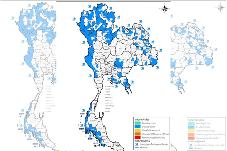 นายไชยวัฒน์ จุนถิระพงศ์ อธิบดีกรมป้องกันและบรรเทาสาธารณภัย (ปภ.) เปิดเผยว่า กองอำนวยการป้องกันและบรรเทาสาธารณภัยกลาง (กอปภ.ก.) ได้ติดตามสภาวะอากาศและพิจารณาปัจจัยเสี่ยง ประกอบกับกรมอุตุนิยมวิทยาได้มีประกาศฉบับที่ 3 (117/2567) ลงวันที่ 22 มิถุนายน 2567 เวลา 17.00 น. แจ้งว่า ประเทศไทยมีปริมาณฝนเพิ่มขึ้น และมีฝนตกหนักถึงหนักมากในบางพื้นที่ อาจทำให้เกิดน้ำท่วมฉับพลัน และน้ำป่าไหลหลาก สำหรับคลื่นลมบริเวณทะเลอันดามันมีกำลังค่อนข้างแรง โดยบริเวณทะเลอันดามันมีคลื่นสูง 2-3 เมตร บริเวณที่มีฝนฟ้าคะนองคลื่นสูงมากกว่า 3 เมตร โดยมีพื้นที่แจ้งเตือนสถานการณ์ระหว่างวันที่ 23 – 26 มิถุนายน 2567 ดังนี้