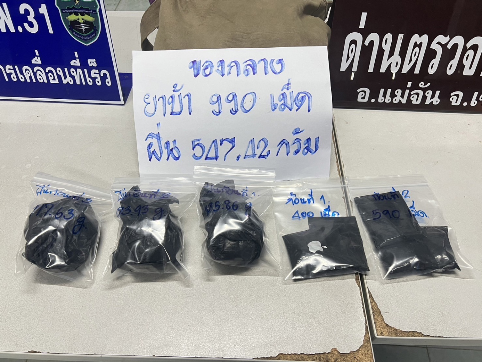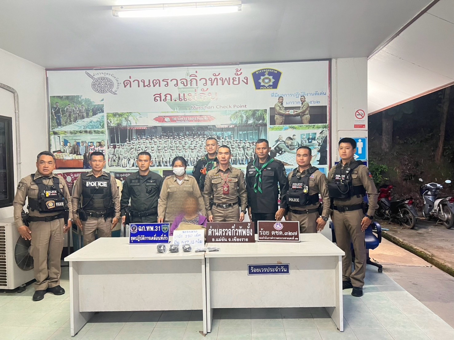 วันที่ 24 มิ.ย.2567 เจ้าหน้าที่ตำรวจ สภ.แม่จัน กำลังทหาร หน่วยเฉพาะกิจกรมทหารพรานที่ 31 กองกำลังผาเมือง ตชด.327 และหน่วยงานที่เกี่ยวข้อง ภายใต้การอำนวยการของ พล.ต.ต.มานพ เสนากูล ผบก.ภ.จว.เชียงราย พ.ต.อ.เกรียงศักดิ์ จิตรประสาน ผกก.สภ.แม่จัน พ.อ.ไพรัช ศรีไชยวาล ผบ.ฉก.ทพ.31 พ.ต.ต.อนัญวัฒน์ รัตนวิชัย ผบ.ร้อย ตชด.327 ได้ปฎิบัติหน้าที่ประจำด่านตรวจกิ่วทัพยั้ง ต.แม่จัน อ.แม่จัน จ.เชียงราย ร่วมกันจับกุม นาง นาพือ (บุคคลไม่มีสัญชาติไทย) อายุ 69 ปี ชาว ม.27 ต.แม่สลองใน อ.แม่ฟ้าหลวง จ.เชียงราย พร้อมของกลาง ยาบ้า 990 เม็ด ฝิ่นดิน 547.42 กรัม