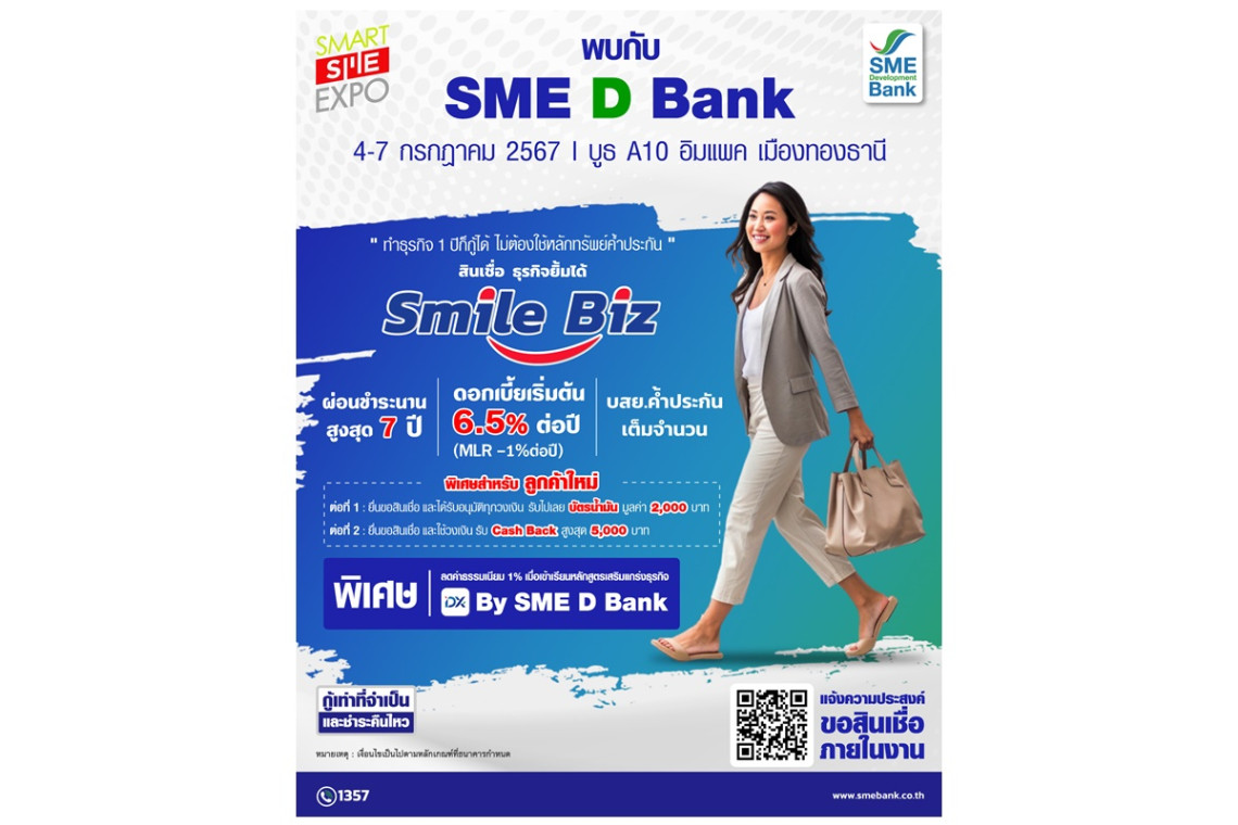SME D Bank อัดโปรเด็ด “เติมทุนคู่พัฒนา” ทำธุรกิจ 1 ปีก็กู้ได้ เสิร์ฟในงาน “Smart SME Expo 2024” วันที่ 4-7 ก.ค. นี้ธนาคารพัฒนาวิสาหกิจขนาดกลางและขนาดย่อมแห่งประเทศไทย (ธพว.)หรือ SME D Bank ยกขบวนโปรโมชั่นเต็มพิกัด “เติมทุนคู่พัฒนา” ให้บริการในงาน Smart SME Expo 2024 ระหว่างวันที่ 4-7 กรกฎาคม 2567 ณ บูธหมายเลข A10 ฮอลล์ 7-8 อิมแพ็ค เมืองทองธานี พบกับสินเชื่อตอบโจทย์ผู้ประกอบการเอสเอ็มอีไทย เงื่อนไขพิเศษสุด! ไฮไลท์คือ สินเชื่อ “Smile Biz ธุรกิจยิ้มได้” ทำธุรกิจมาเพียง 1 ปี สามารถกู้ได้ ไม่ต้องใช้หลักทรัพย์ค้ำประกัน เงื่อนไขผ่อนปรน ครอบคลุมทุกกลุ่มธุรกิจ สร้างโอกาสเข้าถึงแหล่งทุนได้ง่าย วงเงินกู้สูงสุด 5 ล้านบาท อัตราดอกเบี้ยเริ่มต้น 6.50% ต่อปี ผ่อนชำระนานสูงสุด 7 ปี พร้อมปลอดชำระหนี้เงินต้นสูงสุด 6 เดือน ช่วยเสริมสภาพคล่อง เดินหน้าธุรกิจเต็มกำลัง ควบคู่กับให้บริการด้าน “การพัฒนา” ผ่านแพลตฟอร์ม “DX by SME D Bank” (dx.smebank.co.th) ช่วยต่อยอดยกระดับธุรกิจเติบโตอย่างแข็งแกร่ง นอกจากนั้น สำหรับลูกค้าใหม่ยังไม่เคยใช้บริการสินเชื่อจาก SME D Bank มาก่อน รับสิทธิประโยชน์เพิ่ม 2 ต่อ ได้แก่ 1.ยื่นขอสินเชื่อภายในงาน และได้รับอนุมัติทุกวงเงิน รับบัตรเติมน้ำมัน มูลค่า 2,000 บาท และ 2.ยื่นขอสินเชื่อ และใช้วงเงินรับ “Cash Back” มูลค่าสูงสุด 5,000 บาท สอบถามข้อมูลเพิ่มเติม Call Center 1357