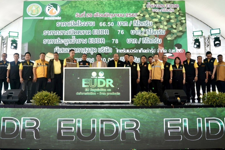 ร้อยเอก ธรรมนัส กล่าวเพิ่มเติมว่า อีกส่วนหนึ่งที่สำคัญคือการยกระดับผลผลิตยางพาราให้ตรงตามมาตรฐานที่ผู้ซื้อยางหรือตลาดโลกต้องการ การเตรียมความพร้อมของพี่น้องเกษตรกรจึงเป็นส่วนสำคัญ โดยเฉพาะในเรื่องกฎระเบียบ EUDR ที่จะเริ่มบังคับใช้กับผลิตภัณฑ์ยางพาราในเดือนธันวาคมสิ้นปีนี้ ซึ่งขณะนี้ กยท. ได้จัดเตรียมระบบข้อมูลยางพาราไทยให้เป็นไปตามเงื่อนไข ทั้งระบบลงทะเบียนเกษตรกรที่จะต้องใช้เป็นพื้นฐาน รองรับกฎระเบียบฯ ซึ่งการจัดทำระบบสารสนเทศทางภูมิศาสตร์ (RAOT GIS) ของ กยท. เป็นอีกหนึ่งระบบที่ได้รับการรองรับตามกฎระเบียบ EUDR ในขณะนี้ ซึ่งภาคเอกชนเองก็มีส่วนสำคัญในการผลักดันยางไทย ทั้งนี้ มั่นใจว่าหากภาคเอกชนและภาครัฐร่วมประสานความร่วมมือและเดินไปในทิศทางเดียวกันแล้ว จะสามารถไปถึงเป้าหมายที่วางไว้ได้อย่างมีประสิทธิภาพและเกิดประโยชน์สูงสุดต่อเกษตรกรชาวสวนยางแน่นอน