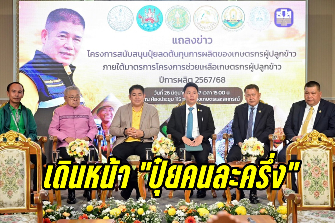 วันที่ 26 มิ.ย.67 ร้อยเอก ธรรมนัส พรหมเผ่า รัฐมนตรีว่าการกระทรวงเกษตรและสหกรณ์ พร้อมด้วย นายอรรถกร ศิริลัทธยากร รัฐมนตรีช่วยว่าการกระทรวงเกษตรและสหกรณ์ นายประยูร อินสกุล ปลัดกระทรวงเกษตรและสหกรณ์ นายณัฏฐกิตติ์ ของทิพย์ อธิบดีกรมการข้าว นายปราโมทย์ เจริญศิลป์ นายกสมาคมชาวนาไทย และนายจารึก กมลอินทร์ ประธานกรรมการกลางศูนย์ข้าวชุมชนระดับประเทศ แถลงข่าวโครงการสนับสนุนลดต้นทุนการผลิตของเกษตรกรผู้ปลูกข้าว ภายใต้มาตรการช่วยเหลือเกษตรกรผู้ปลูกข้าวปีการผลิต 2567/68 ณ ห้องประชุมกระทรวงเกษตรและสหกรณ์ เพื่อเป็นการสร้างการรับรู้และความเข้าใจให้กับเกษตรกรที่สนใจเข้าร่วมโครงการฯ การสมัครเข้าร่วมโครงการฯ ประโยชน์ที่ได้รับจากการเข้าร่วมโครงการฯ รวมไปถึงการใช้ปุ๋ยอย่างมีประสิทธิภาพ ตลอดจนการสร้างความเข้าใจให้กับผู้ประกอบการถึงเงื่อนไขและคุณสมบัติการเข้าร่วมโครงการ เพื่อให้บรรลุเป้าหมายตามนโยบายของรัฐบาลในการลดค่าใช้จ่ายสำหรับการซื้อปัจจัยการผลิต และนำไปสู่การเพิ่มรายได้ของเกษตรกรเป็น 3 เท่า ในระยะเวลา 4 ปี ทำให้รายได้ของเกษตรกรผู้ปลูกข้าวเพิ่มขึ้น และสามารถพึ่งพาตนเองได้