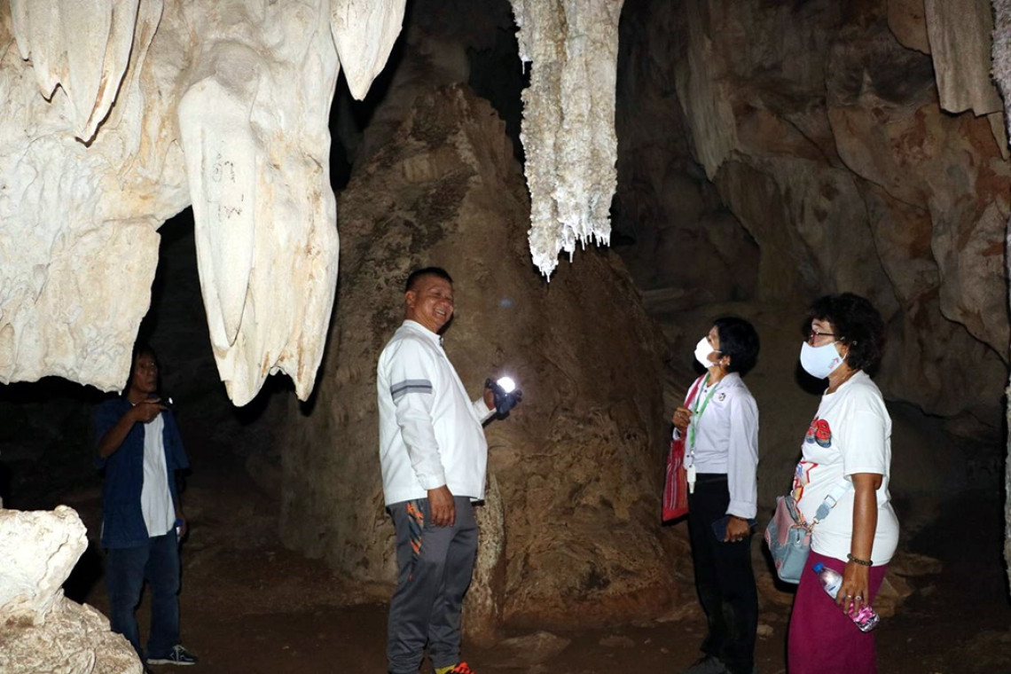 ทริปนี้ ผศ.ดร.เชิดชัย ธุระแพง รองอธิการบดี มหาวิทยาลัยราชภัฎหมู่บ้านจอมบึง ได้อาสาพาคณะสื่อเข้าไปชมภายในถ้ำ เริ่มจากบริเวณทางขึ้นถ้ำนั้นจะต้องเดิน ขึ้นบันไดไปเรื่อยๆ เป็นเส้นทางที่ผ่านป่าไผ่รวก ป่าไม้เบญจพรรณ และหินขรุขระมากมาย การเดินทางลักษณะขึ้นที่สูง ราบ สลับกัน ระยะทางเกือบ 1 กิโลเมตร จนถึงปากถ้ำที่ค่อนข้างกวาง ภายในถ้ำมีใหญ่ กระจายออกไปประมาณ 9 ห้อง ต้องเดินลงบันไดเข้าไป ด้านหน้าจะมีลักษณะคล้ายห้องโถงใหญ่ มีพระพุทธรูปปางเปิดโลกประดิษฐานอยู่ จากนั้นเดินผ่านห้องต่าง ๆ ที่มีความมืด ต้องใช้ไฟฉายส่องสว่างในการนำทางเข้าไป ยังพบฝูงค้างคาวเกาะบินอาศัยอยู่บริเวณผนังถ้ำ เมื่อเดินผ่านห้องนี้เข้าไปอีก ก็จะพบหินงอกหินย้อยรูปทรงสวยงามแปลกตา ด้านในยังพบที่ฝังสรีระสังขารของพระกิมใช้ สทธาธโน ( กิมใช้ ศรีเอี่ยมกูล ) อดีตเจ้าอาวาสองค์ก่อน ซึ่งถูกนำมาฝั่งไว้ภายในถ้ำแห่งนี้ ซึ่งก่อนที่ท่านจะมรณภาพได้สั่งลูกศิษย์ให้นำร่างฝั่งมาเก็บไว้ที่แห่งนี้ ด้านหลังหลุมฝังสรีระสังขารท่าน หากสังเกตดี ๆ จะเห็นก้อนหินทรงประหลาดคล้ายหัวม้า มีลูกตา มีจมูกสีเทาดำ มีปาก ชัดเจน หลังจากเดินทางผ่านห้องนี้แล้วก็ยังมีห้องอีกหลายห้องที่มีผนังถ้ำมีรูปทรงคล้ายสัตว์ต่าง ๆ บางจุดพบหินกำลังงอกย้อยลงมาเป็นแท่งหยดน้ำที่ใสสวยงามมาก