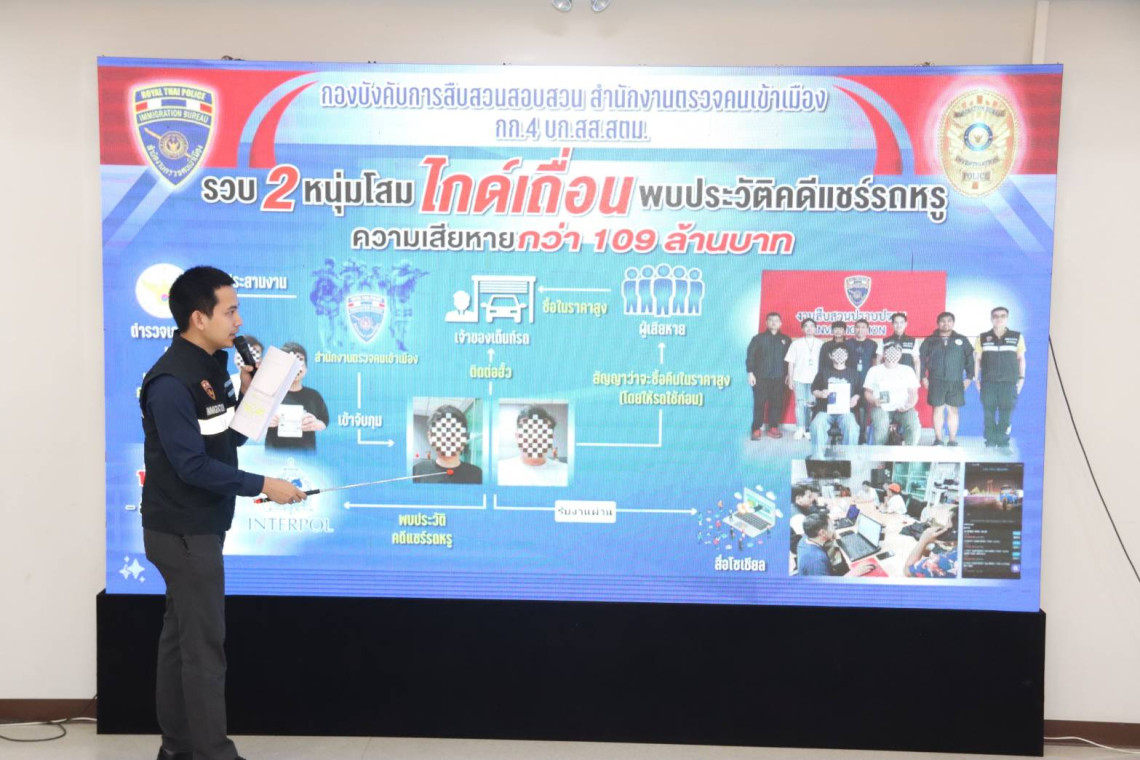 วันที่ 27 มิ.ย.67 ที่ สตม.ภายใต้การอำนวยการของ พล.ต.ท.อิทธิพล อิทธิสารรณชัย ผบช.สตม., พล.ต.ต.พันธนะ นุชนารถ รอง ผบช.สตม., พล.ต.ต.ประพันธ์ศักดิ์ ประสานสุข ผบก.สส.สตม., พ.ต.อ.รัฐโชติ โชติคุณ รอง ผบก.สส.สตม., พ.ต.อ.ภาณุภาคยณ์ จิตต์ประยูรตี รอง ผบก.สส.สตม., พ.ต.อ.ชิตเดชา สองห้อง รอง ผบก.สส.ภ.7 ปฏิบัติราชการ บก.สส.สตม., พ.ต.อ.ธวัชชัย นรินรัตน์ ผกก.1 บก.สส.สตม., พ.ต.อ.รัฐพงศ์ แก้วยอด ผกก.4 บก.สส.สตม. แถลงข่าวจับกุม 2 หนุ่มโสม ไกด์เถื่อน พบประวัติคดีแชร์รถหรู ความเสียหายกว่า 109 ล้านบาท