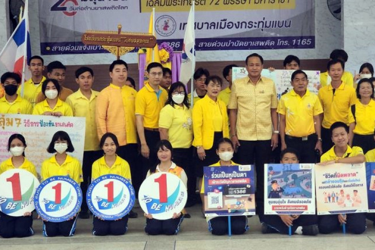 เมื่อวันที่ 27 มิ.ย.67 เทศบาลเมืองกระทุ่มแบน นำโดยนายนิวัฒน์ ขวัญบุญ นายกเทศมนตรีเมืองกระทุ่มแบน อ.กระทุ่มแบน จัดกิจกรรมภายใต้โครงการ วันต่อต้านยาเสพติดโลก ประจำปี 2567 โดยมีนาย บรรพต จันทร์วงษ์ นอภ.กระทุ่มแบน มาร่วมเปิดงานในพิธี “ที่บริเวณอาคารเฉลิมพระเกียรติ 60 พรรษา ร.9” อ.กระทุ่มแบน จ.สมุทรสาคร โดยมีคณะผู้บริหารฯ และข้าราชการในสังกัดเทศบาลฯ ตัวแทนนักเรียนนักศึกษา และพ่อค้าประชาชน เข้าร่วมรวมตัวออกเดินขบวนรณรงค์ เพื่อให้ประชาชนต่อต้านปัญหายาเสพติด โดยกล่าวปฏิญาณตนเพื่อประกาศเจตนารมณ์ร่วมกัน ณ เบื้องหน้าพระบรมฉายาลักษณ์พระบาทสมเด็จพระเจ้าอยู่หัวฯ