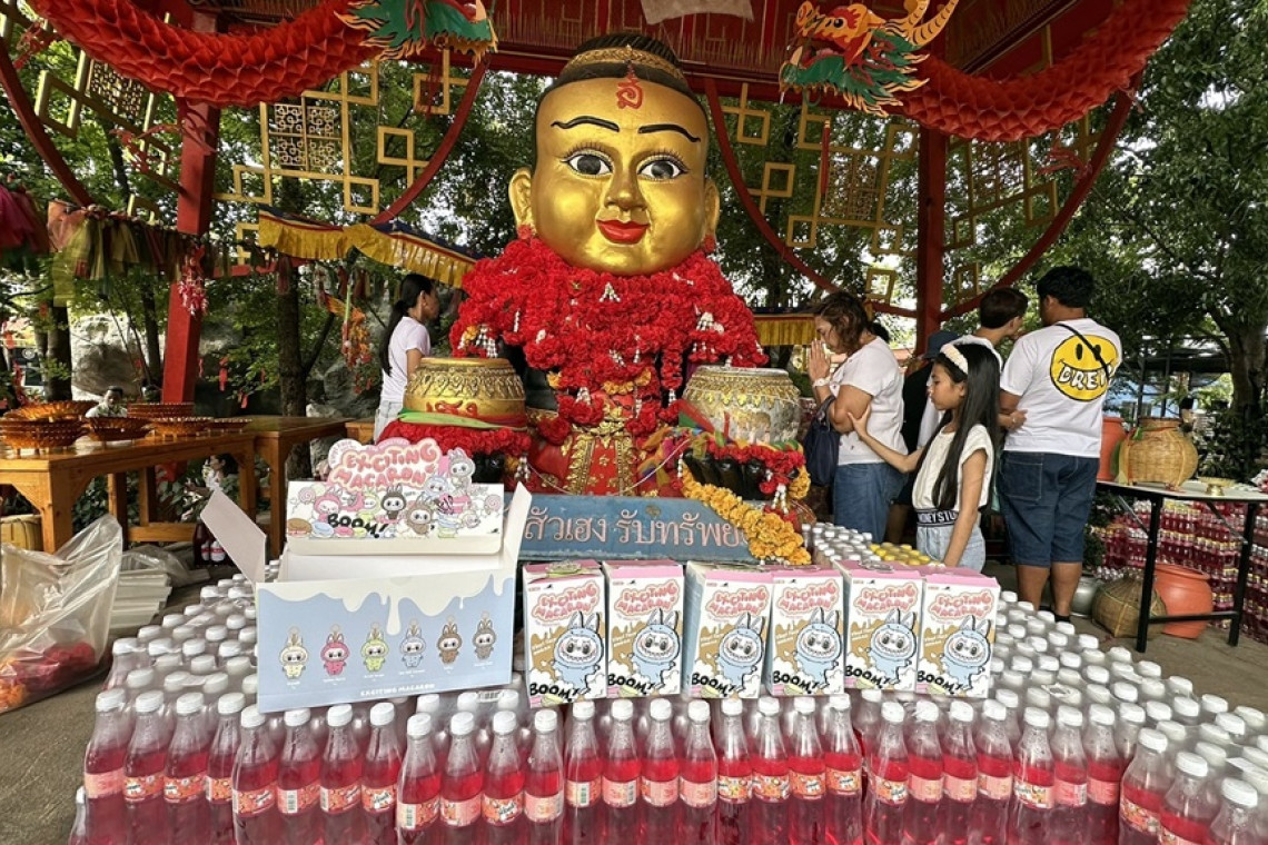 โดยวันนี้มีประชาชนมากมาย นำสิ่งของต่างๆมาแก้บนทั้งขนม ของเล่น น้ำแดง อาหารและตุ๊กตาลาบูบู้ที่เป็นกระแสตนี้จากการสอบถาม น.ส.วรารัตน์ หาสูงเนิน อายุ 40 ปี แม่ค้าออนไลน์ชาวโคราชที่เดินทางนำรูมอเตอร์ไซด์ไฟฟ้าสำหรับเด็กมาถวายกุมารทองเจ้าสัวเฮงหลังขอให้ได้ยอดปังๆ โดย น.ส.วรารัตน์ได้กล่าวว่าวันนี้นำมอเตอร์ไซด์ไฟฟ้าของเด็กมาถวายเพราะขอให้ยอดขายปังๆซึ่งตนมายังอาศรมแห่งนี้สามรอบแล้ว มาขอทุกครั้งกลับไปก็เฮงทุกครั้ง
