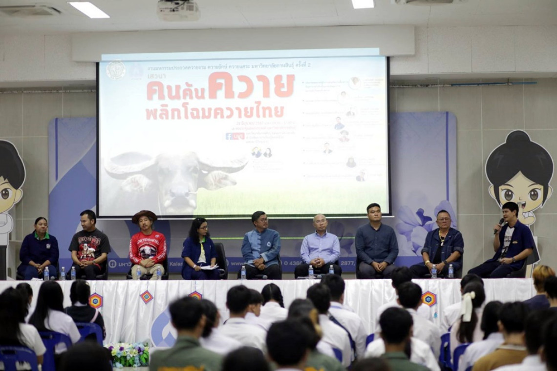 วันที่ 28 มิ.ย.67 ที่หอประชุมอเนกประสงค์ มหาวิทยาลัยกาฬสินธุ์ พื้นที่ในเมือง รองศาสตราจารย์จิระพันธ์ ห้วยแสน อธิการบดีมหาวิทยาลัยกาฬสินธุ์ เป็นประธานเปิดการเสวนาในหัวข้อ "คนค้นควาย พลิกโฉมควายไทย" หนึ่งในกิจกรรมงานเกษตรแฟร์กาฬสินธุ์ ครั้งที่ 3 ซึ่งเวทีเสวนามหาวิทยาลัยกาฬสินธุ์ร่วมกับมหาวิทยาลัยเกษตรศาสตร์ และภาคีเครือข่ายจัดขึ้น เพื่อเปิดประสบการณ์ แนวคิด ของคนเลี้ยงควาย ผู้ที่มีส่วนเกี่ยวข้องในเรื่องของควาย ทั้งภาคเกษตรกร ภาคการศึกษา ภาครัฐ และภาคเอกชน ได้เห็นถึงความสำคัญ ทิศทางอนาคตการพัฒนา และความอยู่รอดของควายไทย ในโลกปัจจุบันที่มีอัตราการแข่งขันสูงในทุกด้าน