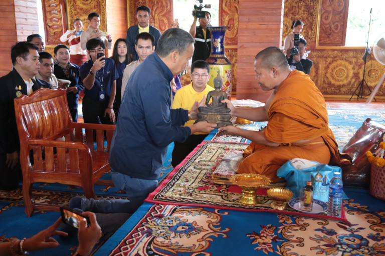 เมื่อเวลา 16.00 น. วันที่ 29 มิ.ย. 67 นายเศรษฐา ทวีสิน นายกรัฐมนตรีและคณะ เดินทางมายังวัดสระบานสนวน ต.สำโรงตาเจ็น อ.ขุขันธ์ จังหวัดศรีสะเกษ เพื่อรับฟังปัญหาและพบปะพี่น้องประชาชน โดยนายกฯได้กราบนมัสการพระมหามังกร กนฺตปุญฺโญ ผู้รักษาการแทนเจ้าคณะอำเภอขุขันธ์ เจ้าอาวาสวัดโคกโพน ก่อนถวายเครื่องไทยธรรม โดยพระมหามังกร กนฺตปุญฺโญ มอบพระพุทธรูปพระพุทธเมตตา หน้าตัก 9 นิ้วและปะพรมน้ำพระพุทธมนต์ เพื่อความเป็นสิริมงคล