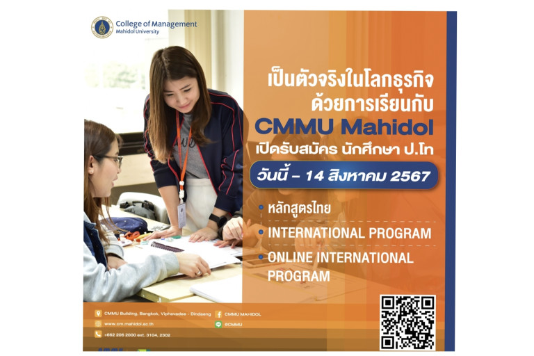 วิทยาลัยการจัดการ มหาวิทยาลัยมหิดล หรือ ซีเอ็มเอ็มยู (CMMU) เปิดรับสมัครผู้สนใจเข้าศึกษาต่อระดับปริญญาโท เพื่อพัฒนาองค์ความรู้ที่ทันสมัยให้แก่ผู้เรียน สร้างทักษะเฉพาะทาง เพิ่มโอกาสในหน้าที่การงาน สู่การเป็นตัวจริงในโลกธุรกิจ โดยหลักสูตรที่เปิดรับสมัคร ได้แก่ หลักสูตรไทย ในสาขาการจัดการธุรกิจ สาขาทุนมนุษย์และการจัดการองค์กร สาขาการเงิน สาขาการตลาด สาขาการจัดการและกลยุทธ์ สาขาภาวะผู้ประกอบการและนวัตกรรม สาขาการจัดการธุรกิจสุขภาพ หลักสูตรนานาชาติ Corporate Finance (CF), Entrepreneurship Management (EN), General Management (GM), Healthcare & Wellness Management (HWM), Marketing and Management (MM), Double Degree Int'l Management (GMDD) และ หลักสูตร ออนไลน์ นานาชาติ