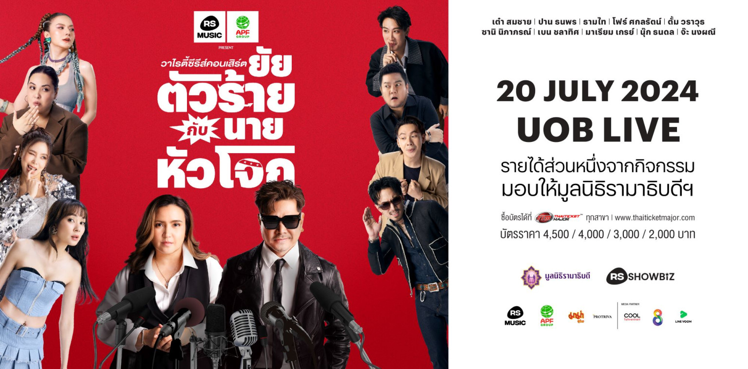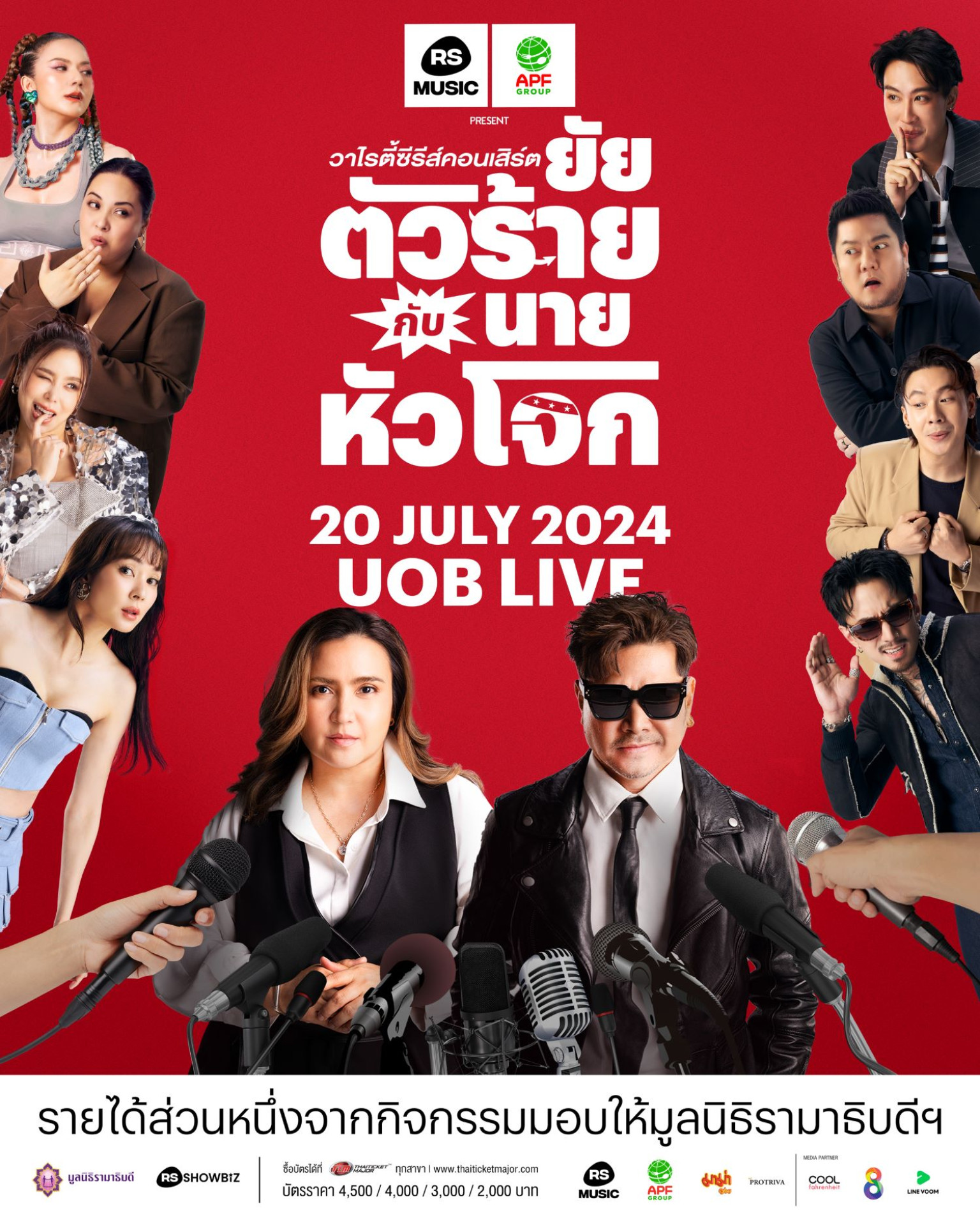 ไม่ใช่แค่การโคจรกลับมาพบกันอย่างยิ่งใหญ่ของแด๊ดดี้ตัวตึงแห่งตึกอาร์เอส “เต๋า สมชาย” กับตัวมัมท๊อปเทียร์ “ปาน ธนพร” ที่จะมาปะทะความสนุกครั้งใหม่ พร้อมศิลปินปากแจ๋วที่สุดของวงการ แต่ RS MUSIC ยังมอบรายได้ส่วนหนึ่งจาก “อำพลฟูดส์ พรีเซนต์ วาไรตี้ซีรีส์คอนเสิร์ต ยัยตัวร้ายกับนายหัวโจก” ให้กับ มูลนิธิรามาธิบดีฯ สมทบทุนโครงการจัดซื้อเครื่องมือแพทย์ เพื่อสถาบันการแพทย์จักรีนฤบดินทร์