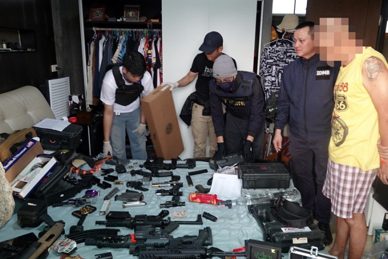 ผลการตรวจค้นพบ 1.อาวุธปืน 38 กระบอก / 2.กระสุนปืนกว่า 800 นัด / 3.เงินสด 127,000 บาท / 4.สมุดบัญชีธนาคาร 16 เล่ม / 5.โฉนดที่ดิน 10 ฉบับ / 6.คู่มือจดทะเบียนรถ 15 เล่ม / 7.โทรศัพท์มือถือ 3 เครื่อง / 8.รถจักรยานยนต์ต้องสงสัย 6 คัน พร้อมอุปกรณ์ส่วนควบ / 9.ยุทธภัณฑ์ผิดกฎหมายจำนวนหลายรายการ