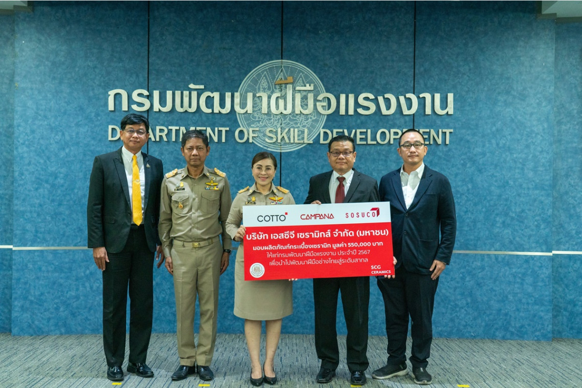 บมจ.เอสซีจี เซรามิกส์ หรือ COTTO นำโดย ณัฏฐ์ เจนสิราสุรัชต์ Technical Services Manager มอบผลิตภัณฑ์กระเบื้องเซรามิกแบรนด์ COTTO, CAMPANA และ SOSUCO จำนวน 2,700 ตารางเมตร รวมมูลค่า 550,000 บาท แก่หน่วยงานของกรมพัฒนาฝีมือแรงงานในพื้นที่ 22 จังหวัดทั่วประเทศ โดยมี บุปผา เรืองสุด อธิบดีกรมพัฒนาฝีมือแรงงาน เป็นผู้รับมอบ ณ ห้องประชุมปกรณ์ อังศุสิงห์ ชั้น 10 กรมพัฒนาฝีมือแรงงาน เพื่อสนับสนุนแรงงานไทยให้ได้รับการอบรมพัฒนาฝีมือ ยกระดับฝีมือช่างสู่ช่างมืออาชีพ รวมทั้งใช้ในการแข่งขันฝีมือแรงงานระดับชาติ (ระดับภาค) ในเดือนกรกฎาคม 2567 นอกจากนี้ เป็นการตอกย้ำผู้นำผลิตภัณฑ์ตกแต่งพื้นผิวและสุขภัณฑ์ในภูมิภาคอาเซียน ตอบโจทย์ไลฟ์สไตล์การสร้างสรรค์ที่อยู่อาศัยให้สวยงาม ลดผลกระทบต่อสิ่งแวดล้อมเพื่อการพัฒนาอย่างอย่างยั่งยืน