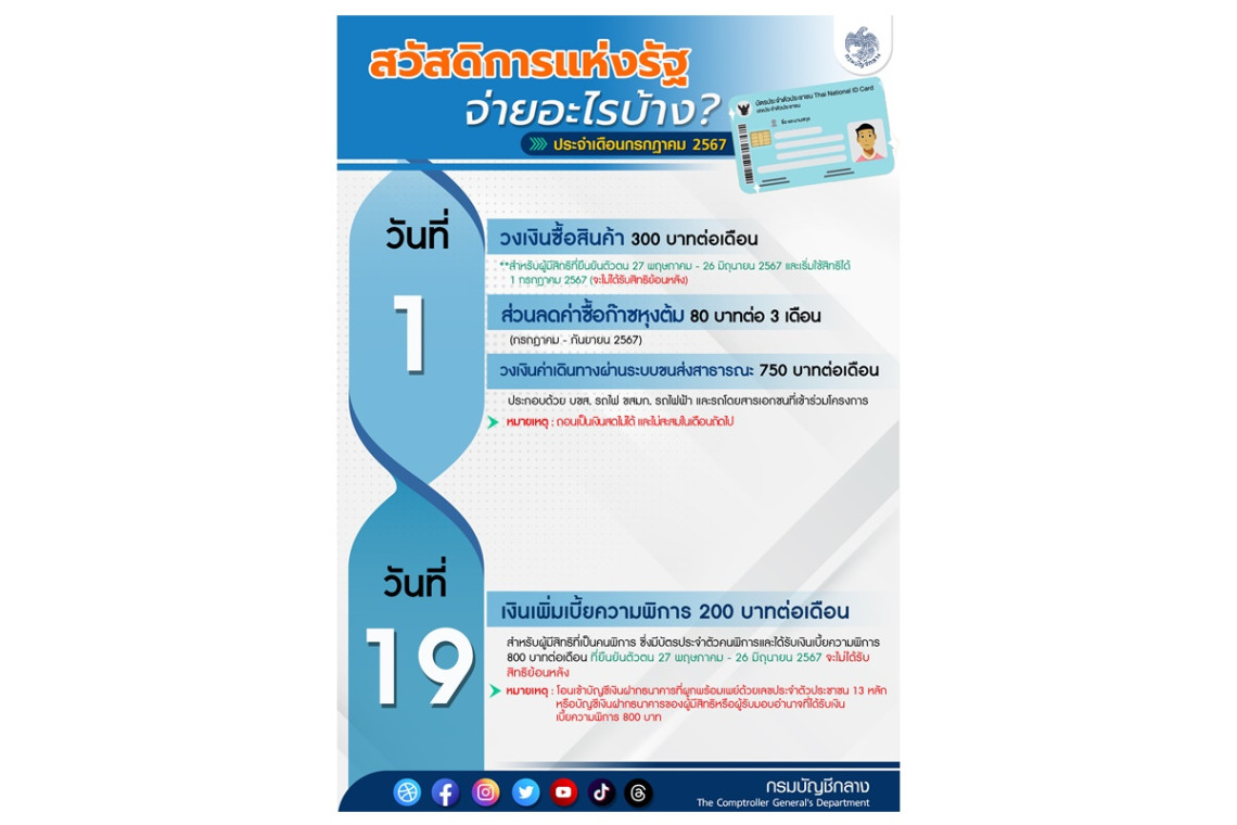 "กรมบัญชีกลาง" อัปเดตสวัสดิการแห่งรัฐ เดือนกรกฎาคม 2567 เช็กที่นี่จ่ายอะไรบ้าง