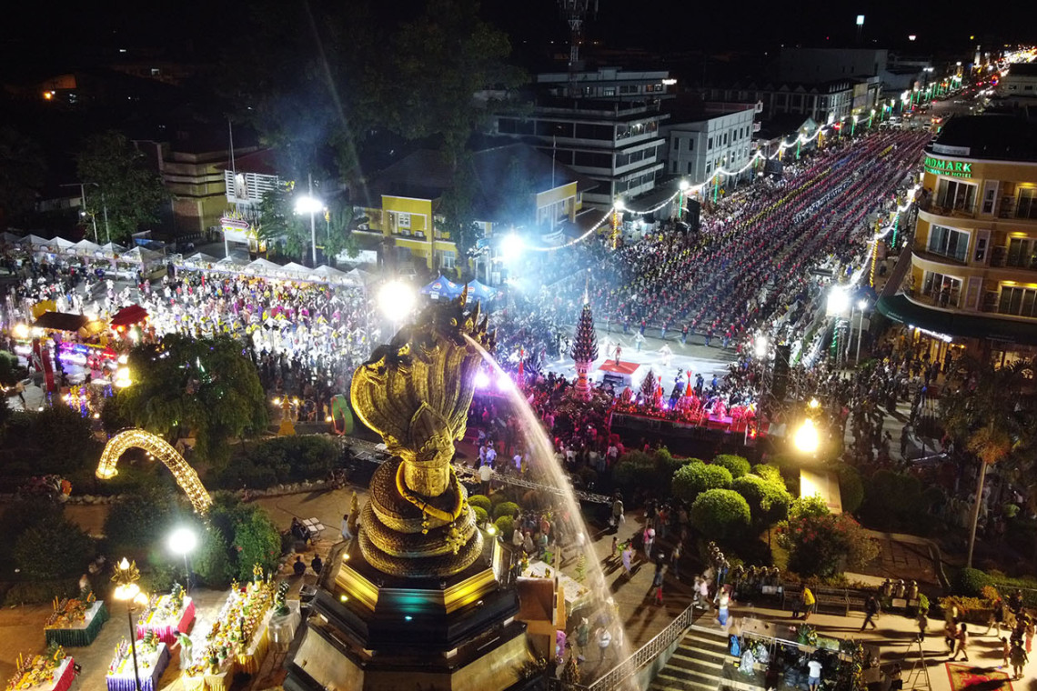 นครพนม อลังการที่เดียวในไทย มนพร รมช.คมนาคม นำพลังศรัทธา จัดพานบายศรียักษ์สูง 7 เมตร พร้อมนางรำนับพัน ถวายองค์พญาศรีสัตนาคราช นาคาธิบดีสองฝั่งโขง จัดยิ่งใหญ่ทุกปี วัน ที่ 7 เดือน 7 รวม 7 วัน 7 คืน กระตุ้นเศรษฐกิจ การค้าการท่องเที่ยว หนุนเมืองรองสู่เมืองหลัก ขานรับนโยบายรัฐบาล ด้านประธานหอการค้า เชื่อพลังศรัทธา สร้างความเปลี่ยนแปลงทุกด้าน ส่วนวันแรก รมช.คมนาคม นำนักท่องเที่ยวร่วมรำถวาย มีน้องน้ำตาล มิสยูนิเวิร์สไทยแลนด์ 2016 พร้อมกัปตัน ชมพู่ รำถวาย สร้างสีสัน