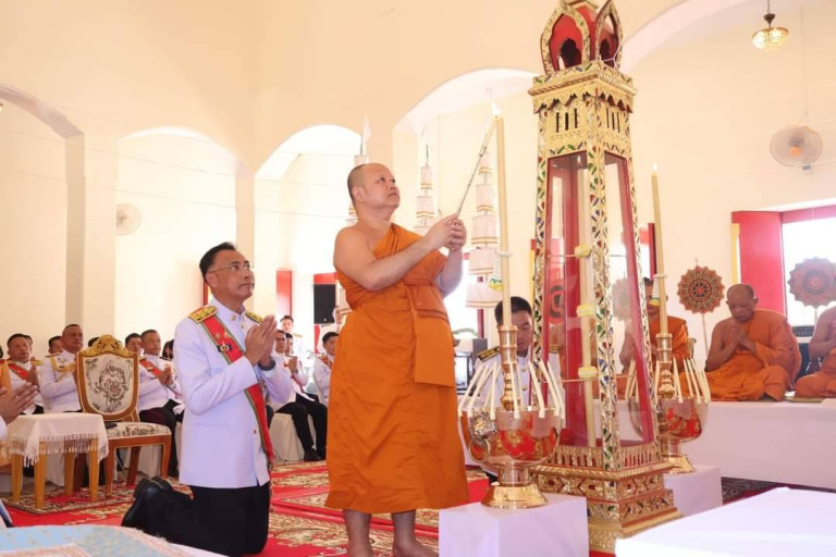 ฤกษ์เวลา 17.09 น. ประธานสงฆ์จุดเทียนชัยและเทียนพุทธาภิเษก พระสงฆ์ 10 รูปเจริญพระพุทธมนต์คาถาจุดเทียนชัย เจ้าหน้าที่ประโคมฆ้องชัย เจ้าหน้าที่อาราธนาพระปริตร พระสงฆ์เจริญพระพุทธมนต์ จากนั้นผู้ว่าราชการจังหวัดยโสธรจุดเทียนมหามงคล เทียนทำน้ำมนต์หน้าพระสงฆ์ และเทียนนวหรคุณ พระสงฆ์เถราจารย์และพระสงค์สวดภาณวาร หลังจากนั้นผู้ว่าราชการจังหวัดยโสธร จุดเทียนทอง เทียนเงิน และธูปเทียนหน้าเตียงพระสวดภาณวาร นั่งเจริญจิตภาวนาอธิษฐานจิตและสวดภาณวาร เพื่อความเป็นสิริมงคล