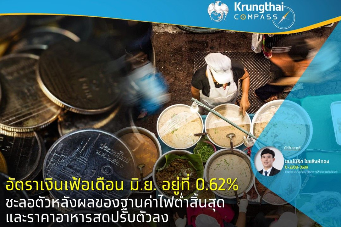 Krungthai COMPASS ระบุว่า อัตราเงินเฟ้อทั่วไปเดือน มิ.ย. อยู่ที่ 0.62% ขยายตัวในอัตราที่ชะลอลงจากผลของฐานค่ากระแสไฟฟ้าที่ต่ำสิ้นสุดลง และราคาอาหารสดปรับลดลง อัตราเงินเฟ้อทั่วไปเดือน มิ.ย. ขยายตัว 0.62%YoY เติบโตในอัตราที่ชะลอลงจากเดือนก่อนที่ 1.54%YoY และต่ำกว่าการคาดการณ์ของนักวิเคราะห์ที่ 1.1% จากหมวดพลังงานที่ขยายตัว 2.43%YoY ชะลอลงจากเดือนก่อนที่ 7.15%YoY ด้วยผลกระทบจากฐานค่าไฟที่ต่ำเมื่อปีก่อนสิ้นสุดลง ประกอบกับราคาหมวดอาหารสดเติบโตได้เพียง 0.19%YoY ชะลอลงจาก 1.51%YoY ในเดือนก่อน ตามราคาเนื้อสัตว์ที่หดตัว และราคาผักสดที่ชะลอตัวลง เนื่องจากสภาพอากาศเริ่มเอื้ออำนวยต่อการเพาะปลูกหลังจากสภาพอากาศร้อนจัดสิ้นสุดลง