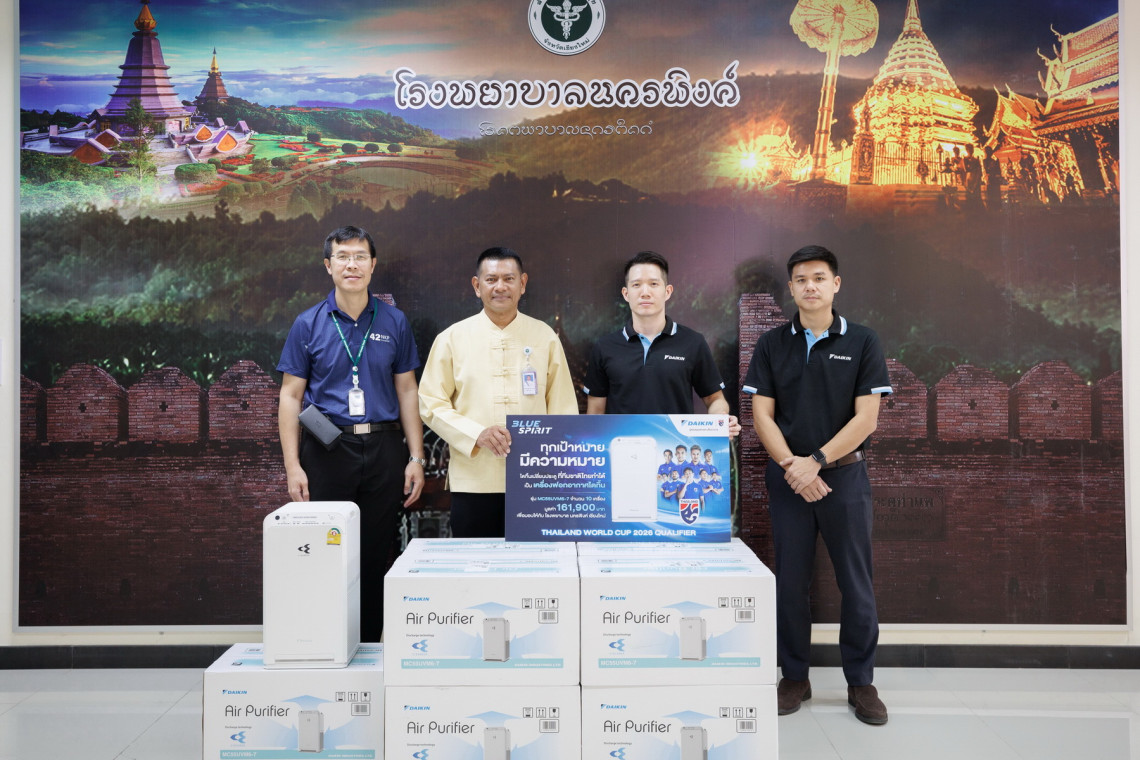 นายวัลลภ พ่วงไพโรจน์ กรรมการบริษัทและผู้จัดการทั่วไปอาวุโส บริษัทไดกิ้น อินดัสทรีส์ (ประเทศไทย) จำกัด กล่าวถึงบทสรุปความสำเร็จของแคมเปญ “ทุกเป้าหมาย มีความหมาย” ว่า แคมเปญนี้ไดกิ้นได้เชิญชวนคนไทยร่วมเชียร์ฟุตบอลทีมชาติไทย ในการแข่งขันฟุตบอลโลกรอบคัดเลือกโซนเอเชีย ตั้งแต่ช่วงปลายปีที่แล้วจนถึงเมื่อเดือน มิ.ย.67 ที่ผ่านมา เพื่อให้ทีมชาติไทยมีขวัญและกำลังใจและคว้าชัยชนะในการแข่งขันในแต่ละแมตช์ ซึ่งในฐานะที่ไดกิ้นเป็นผู้เชี่ยวชาญด้านอากาศและเป็นผู้สนับสนุนหลักฟุตบอลทีมชาติไทย จึงได้จัดแคมเปญสนุกๆ “ทุกเป้าหมาย มีความหมาย” ทั้งช่องทาง Online และ On-ground โดยตั้งเป้าหมายบริจาคเครื่องฟอกอากาศ สำหรับการแข่งขันฟุตบอลโลกรอบคัดเลือกในทั้ง 5 นัดที่ผ่านมา ซึ่งทุกๆ 1 ประตู ที่ทีมชาติไทยทำได้ เราบริจาคเพิ่มประตูละ 5 เครื่อง โดยเราได้บริจาคเครื่องฟอกอากาศไดกิ้น รุ่น MC55UVM6-7 ซึ่งผลการแข่งขันทำให้เราได้ยอดการบริจาคเครื่องฟอกถึง 55 เครื่อง ใน 3 โรงพยาบาลได้แก่ โรงพยาบาลนครพิงค์ จ.เชียงใหม่ จำนวน 10 เครื่อง ในช่วงเดือน พ.ย.66 โรงพยาบาลชลบุรี จ.ชลบุรี 15 เครื่อง ในช่วงเดือน มี.ค.67 และปิดท้ายที่โรงพยาบาลน้ำพอง จังหวัดขอนแก่น 30 เครื่อง ในช่วงเดือน มิ.ย. 67 ซึ่งทั้ง 3 โรงพยาบาลอยู่ในพื้นที่ที่มีผลภาวะฝุ่น PM 2.5 และตั้งอยู่ในเขตอุตสาหกรรม รวมมูลค่าทั้งสิ้นกว่า 900,000 บาท