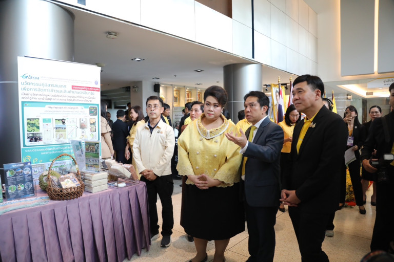 ด้าน ดร.ปกรณ์ อาภาพันธุ์ ผู้อำนวยการ GISTDA กล่าวว่า GISTDA ได้นำเสนอการส่งเสริมจากการใช้ประโยชน์เทคโนโลยีอวกาศและนวัตกรรมภูมิสารสนเทศ เพื่อความปลอดภัย มั่นคง และยั่งยืนของท้องถิ่น โดยเฉพาะนวัตกรรมภูมิสารสนเทศในรูปแบบแอพพลิเคชั่นในรูปแบบต่างๆ เพื่อให้ประชาชนและผู้ที่สนใจ ติดตาม และเฝ้าระวังการเปลี่ยนแปลงของสภาพภูมิอากาศที่ส่งผลต่อการทำการเกษตร รวมทั้งนำระบบตรวจสอบย้อนกลับที่ใช้ข้อมูลภูมิสารสนเทศที่เกิดจากการมีส่วนร่วมของเกษตรกร/กลุ่มเกษตรกร และชุมชน มาสร้างมูลค่าให้กับผลิตภัณฑ์ทางการเกษตรช่วยให้เกษตรกรมีรายได้ให้เพิ่มขึ้น อีกทั้ง GISTDA ได้นำตัวอย่างผลิตภัณฑ์ทางการเกษตรที่ใช้นวัตกรรมดังกล่าวของกลุ่มเกษตรกรในพื้นที่จังหวัดร้อยเอ็ด พิษณุโลก มหาสารคาม สุรินทร์ และยโสธร โดยได้รับความสนใจจากหน่วยงานภายใต้ อว. เป็นอย่างมาก