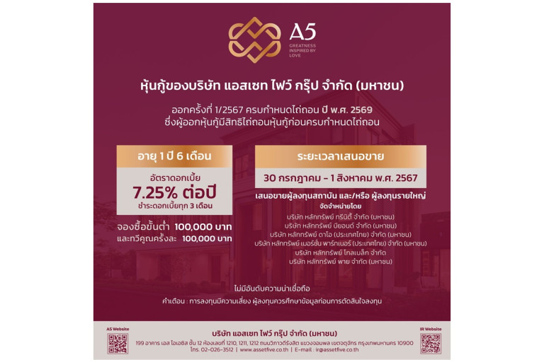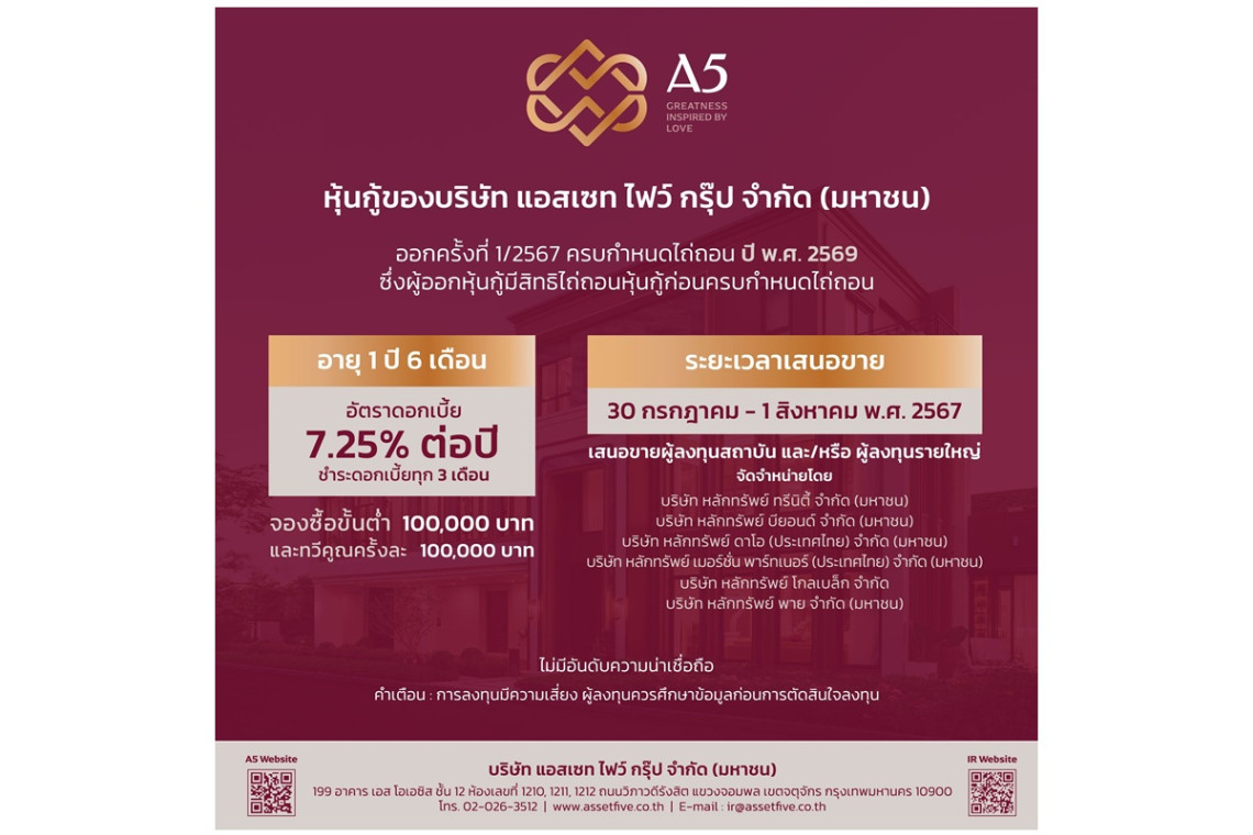 นายศุภโชค ปัญจทรัพย์ ประธานเจ้าหน้าที่บริหาร บริษัท แอสเซท ไฟว์ กรุ๊ป จำกัด (มหาชน) หรือ A5 กล่าวเสริมว่า บริษัทมีจุดแข็งด้านความเชี่ยวชาญการพัฒนาโครงการที่อยู่อาศัย โดยเน้นพัฒนาโครงการประเภทแนวราบลักชัวรีเป็นหลัก ซึ่งได้รับการตอบรับที่ดีจากกลุ่มลูกค้าเรียลดีมานด์มาโดยตลอด จึงเดินหน้าพัฒนาโครงการอย่างต่อเนื่อง มุ่งเน้นพัฒนาที่อยู่อาศัยบนทำเลศักยภาพ โซนกรุงเทพฯ ตะวันออก-ตก ด้วยจุดเด่นดีไซน์ที่แตกต่าง พื้นที่ใช้สอยคุ้มค่า วัสดุก่อสร้าง-ตกแต่งที่มีมาตรฐาน รวมถึงบรรยากาศภายนอกที่เป็นส่วนหนึ่งของธรรมชาติ สร้างสุนทรียภาพของการอยู่อาศัย ตอบโจทย์กลุ่ม Niche Market ที่มีไลฟ์สไตล์และความสนใจชัดเจน ซึ่งถือเป็นกลุ่มเป้าหมายที่บริษัทมีความเชี่ยวชาญ ผ่านการวิจัยศึกษาตลาดและพฤติกรรมกลุ่มเป้าหมาย อีกทั้งยังคงมองหาโอกาสขยายโครงการไปในทำเลที่มีศักยภาพสูง เพื่อพัฒนาโครงการใหม่เพิ่มเติมในอนาคต เพื่อสร้างโอกาสทางการขายผลักดันให้ยอดขายเป็นไปตามเป้าหมายที่วางไว้ “มั่นใจว่าการออกเสนอขาย หุ้นกู้ AFIVE ครั้งที่ 1/2567 จะได้รับการตอบรับที่ดีจากนักลงทุน สำหรับวัตถุประสงค์การออกและเสนอขายหุ้นกู้ครั้งนี้เพื่อนำไปชำระคืนหุ้นกู้ชุดเดิมที่กำลังจะครบกำหนด และเป็นเงินทุนหมุนเวียนของบริษัท ช่วยเสริมสภาพคล่องทางการเงิน รองรับการขยายโครงการใหม่ สร้างการเติบโตอย่างต่อเนื่อง” นายศุภโชค กล่าว