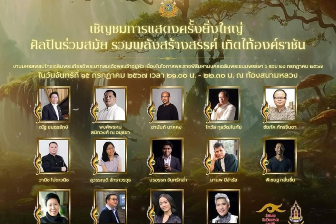 สำนักงานศิลปวัฒนธรรมร่วมสมัยขอเชิญชมการแสดงศิลปะร่วมสมัยเทิดไท้องค์ราชัน ในงานมหรสพสมโภช เฉลิมพระเกียรติพระบาทสมเด็จพระเจ้าอยู่หัว เนื่องในโอกาสมหามงคลเฉลิมพระชนมพรรษา 6 รอบ 28 กรกฎาคม 2567 ในวันจันทร์ที่ 15 กรกฎาคม 2567 เวลา 21.00 – 22.30 น. ณ ท้องสนามหลวง