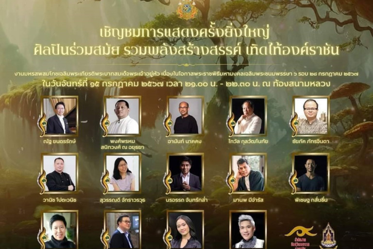 การแสดง “ศิลปะร่วมสมัยเทิดไท้องค์ราชัน” การแสดงประกอบแสง สี เสียง และสื่อผสม ครั้งยิ่งใหญ่ตระการตา เพื่อเทิดพระเกียรติพระมหากษัตริย์ราชวงศ์จักรี 10 รัชกาล โดยมีเนื้อหาถ่ายทอดแนวคิดการน้อมนำแนวพระราชดำริ พระราชปณิธาน และพระบรมราโชบายผ่านผลงานการแสดงศิลปะร่วมสมัย ซึ่งแบ่งออกเป็น 10 องก์ สร้างสรรค์โดยศิลปินร่วมสมัยดีเด่น รางวัล “ศิลปาธร” และเครือข่ายศิลปินร่วมสมัยในสาขาดนตรีและสาขาศิลปะการแสดง อาทิ ณัฐ ยนตรรักษ์, ไกวัล กุลวัฒโนทัย, อานันท์ นาคคง, พงศ์พรหม สนิทวงศ์ ณ อยุธยา, นรอรรถ จันทร์กล่ำ, วานิช โปตะวนิช, ชัยภัค ภัทรจินดา, สุวรรณดี จักราวรวุธ, มานพ มีจำรัส, พิเชษฐกลั่นชื่น, ดำริห์ บรรณวิทยกิจ, อโณทัย นิติพน, ศรวณีย์ ธนะธนิต, สุธีศักดิ์ ภักดีเทวา ฯลฯ