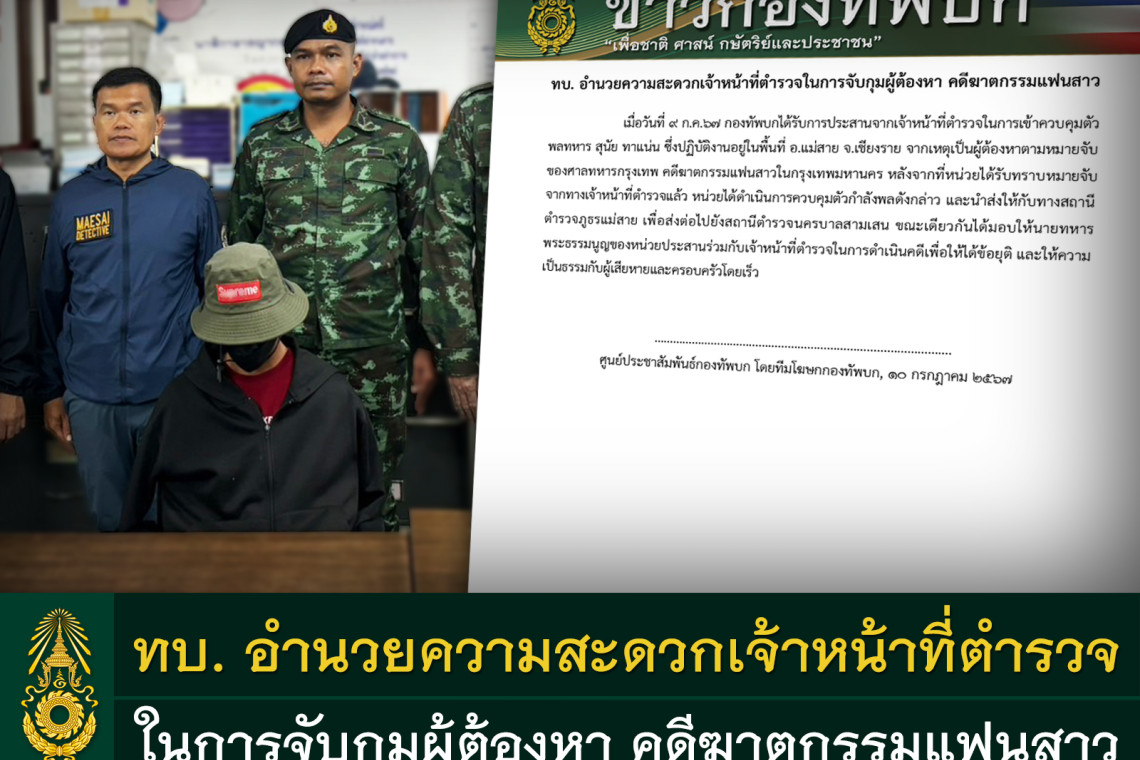เมื่อวันที่ 9 ก.ค.67 กองทัพบกได้รับการประสานจากเจ้าหน้าที่ตำรวจในการเข้าควบคุมตัว พลทหาร สุนัย ทาแน่น ซึ่งปฏิบัติงานอยู่ในพื้นที่ อ.แม่สาย จ.เชียงราย จากเหตุเป็นผู้ต้องหาตามหมายจับของศาลทหารกรุงเทพ คดีฆาตกรรมแฟนสาวในกรุงเทพมหานครหลังจากที่หน่วยได้รับทราบหมายจับจากทางเจ้าหน้าที่ตำรวจแล้ว หน่วยได้ดำเนินการควบคุมตัวกำลังพลดังกล่าว และนำส่งให้กับทางสถานีตำรวจภูธรแม่สายเพื่อส่งต่อไปยังสถานีตำรวจนครบาลสามเสน ขณะเดียวกันได้มอบให้นายทหาร พระธรรมนูญของหน่วยประสานร่วมกับเจ้าหน้าที่ตำรวจในการดำเนินคดีเพื่อให้ได้ข้อยุติ และให้ความเป็นธรรมกับผู้เสียหายและครอบครัวโดยเร็ว