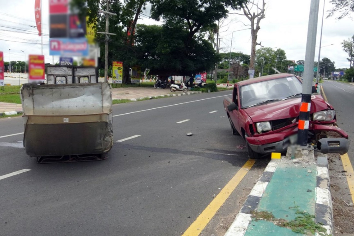 วันที่ 10 ก.ค.67 ศูนย์วิทยุ 191 ของตำรวจภูธรจังหวัดยโสธรได้รับแจ้งว่ามีอุบัติเหตุรถกระบะชนเสาไฟฟ้าและมีผู้บาดเจ็บอยู่ในที่เกิดเหตุโดยเหตุเกิดที่ถนนแจ้งสนิท บริเวณด้านหน้าห้างไทวัสดุ บ้านศาลาแดง ตำบลตาดทอง อำเภอเมือง จังหวัดยโสธร จึงแจ้งให้ร้อยเวรสอบสวนสถานีตำรวจภูธรเมืองยโสธร ออกตรวจที่เกิดเหตุตามที่ได้รับแจ้งเมื่อไปถึงพบรถกระบะยี่ห้อนิสสันสีแดงมีหลังคาแบบตู้ทึบคัน ทะเบียนกรุงเทพมหานคร จอดอยู่บนเกาะกลางถนนในสภาพด้านหน้ารถชนอัดติดกับเสาไฟฟ้าส่องสว่างที่อยู่บนเกาะกลางถนนจนทำให้หน้ารถพังยุบเสียหายและหลังคาตู้ทึบหลุดออกจากตัวรถตกลงไปอยู่บนพื้นถนนกรีดขวางการจราจร โดยมี นายยุทธนัน อายุ 40 ปี อยู่หมู่ 11 ตำบลย่อ อำเภอคำเขื่อนแก้ว จังหวัดยโสธร คนขับซึ่งไม่ได้รับบาดเจ็บแต่อย่างใดยืนดูสภาพรถของตนอยู่ในที่เกิดเหตุ ส่วนเพื่อนของคนขับที่นั่งคู่มาด้วยเป็นชายได้รับบาดเจ็บอาสาฯกู้ภัยได้นำตัวส่งไปรับการรักษาอาการบาดเจ็บเบื้องต้นที่โรงพยาบาลยโสธรก่อนหน้านั้นแล้ว
