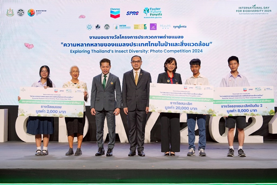นายประเสริฐ ศิรินภาพร เลขาธิการสำนักงานนโยบายและแผนทรัพยากรธรรมชาติและสิ่งแวดล้อม พร้อมด้วย นายชาทิตย์ ห้วยหงษ์ทอง ประธานกรรมการ บริหาร บริษัท เชฟรอนประเทศไทยสำรวจและผลิต จำกัด, นางพรทิพย์ วีระพันธุ์ ผู้ช่วยกรรมการผู้จัดการใหญ่ กิจการเพื่อความรับผิดชอบต่อสังคมและโครงการพิเศษ บริษัท สตาร์ ปิโตรเลียม รีไฟน์นิ่ง จำกัด (มหาชน) และ ดร. พรพรรณ ไวทยางกูร นายกสมาคมส่งเสริมพัฒนากําลังคนสเตมเพื่ออนาคต มอบรางวัลผู้ชนะการประกวดถ่ายภาพ Biodiversity Photo Competition ประจำปี 2567 ภายใต้หัวข้อ “ความหลากหลายของแมลงประเทศไทยในป่าและสิ่งแวดล้อม (Exploring Thailand’s Insect Diversity: Photo Challenge)” ในพิธีเปิดงานวันสากลแห่งความหลากหลายทางชีวภาพ ประจําปี 2567 จัดโดยสํานักงานนโยบายและแผนทรัพยากรธรรมชาติและสิ่งแวดล้อม (สผ.) ตอกย้ำความมุ่งมั่นในการสร้างการตระหนักรู้ด้านความหลากหลายทางชีวภาพ และความสําคัญของแมลงในฐานะดัชนีชี้วัดของความอุดมสมบูรณ์ของระบบนิเวศผ่านเลนส์กล้อง