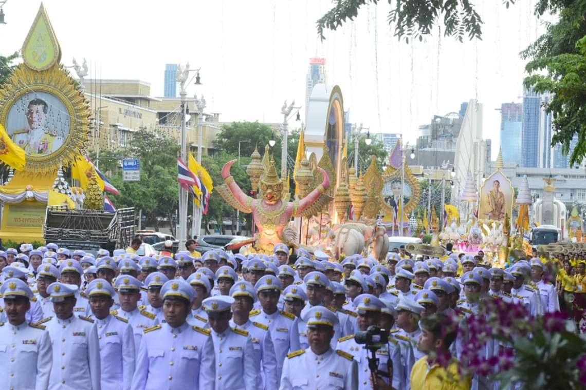 โดยเคลื่อนขบวนจากสี่แยกคอกวัวไปตามเส้นทางถนนราชดำเนิน ถนนหน้าพระลาน ถนนหน้าพระธาตุ และถนนกลางมณฑลพิธีสนามหลวง ก่อนจะปิดท้ายการแสดงสมโภช ด้วยการแสดง รำถวายพระพร ชุด เทพรังสฤษฏ์ จตุรพิธถวายพระพร และการแสดงอากาศยานไร้คนขับ (โดรน) เฉลิมพระเกียรติ จำนวน 1,200 ลำ แปรขบวนแสดงเรื่องราวเกี่ยวกับพระราชกรณียกิจของพระบาทสมเด็จพระเจ้าอยู่หัว ชุด “รวมใจภักดิ์ ถวายพระพร” ตามแนวคิดภายใต้ร่มพระบารมี ปวงประชาจงรักภักดี ที่เวทีกลางมณฑลพิธีสนามหลวง สร้างตื่นตาสุดประทับใจแก่คณะทูตานุทูตประเทศต่างๆ นักท่องเที่ยวชาวต่างชาติ และประชาชนที่มาร่วมชมมรสพสมโภชเป็นจำนวนมาก