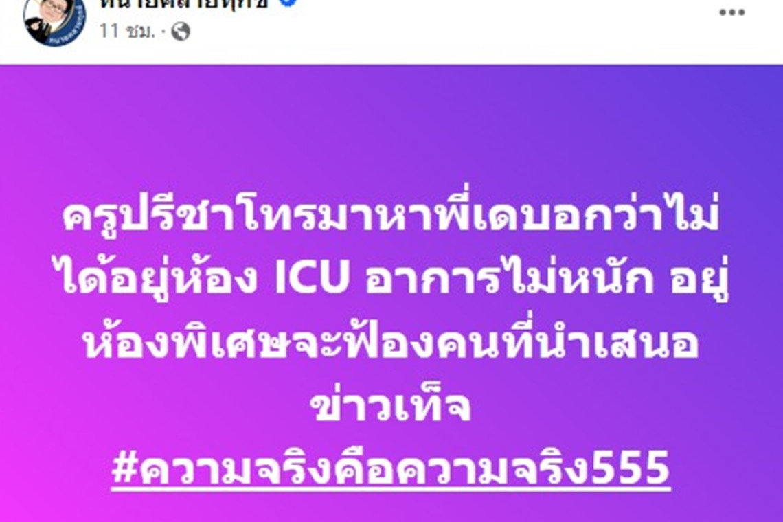 ครูปรีชาโทรมาหาพี่เดบอกว่าไม่ได้อยู่ห้อง ICU อาการไม่หนัก อยู่ห้องพิเศษจะฟ้องคนที่นำเสนอข่าวเท็จ