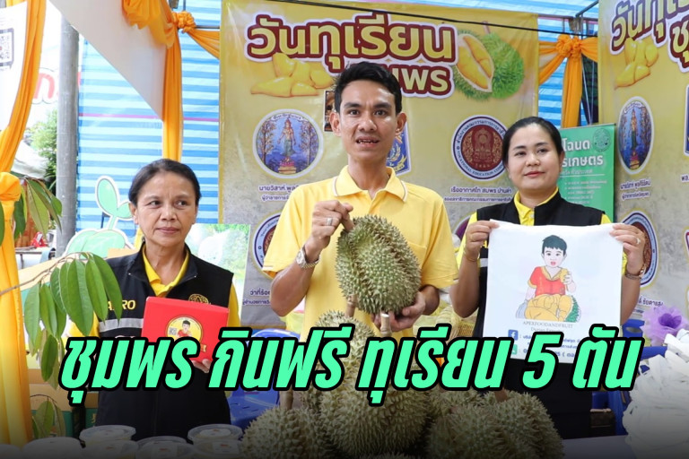ทางด้านบริษัท เอเพ็กซ์ฟู้ดแอนด์ฟรุต จำกัด นำทุเรียนคุณภาพเพื่อการส่งออก ทั้งแบบทุเรียนสด แปรรูปเป็นทุเรียนเชื่อม และทุเรียนทอด มาแจกกินฟรีผู้ที่มาร่วมงานเพื่อเผยแพร่ให้ทุกคนได้รู้ว่าทุเรียนจังหวัดชุมพร ทานอร่อย หอม หวาน รสชาติดี พร้อมทั้งบริษัทได้นำกระเป๋าคุณภาพดีมาแจกให้ผู้ร่วมงานอีกจำนวน 2,000 ใบให้กับผู้ที่ใส่เสื้อสีเหลืองมาร่วมงานในวันนี้ด้วย