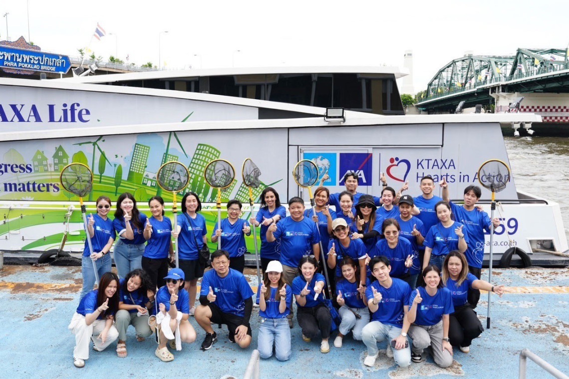 บมจ. กรุงไทย-แอกซ่า ประกันชีวิต ในฐานะผู้นำบริษัทประกันที่ใส่ใจสิ่งแวดล้อม หรือ ‘Green Insurer’ นำโดย คุณ ลาทีฟา ซาอีด ประธานเจ้าหน้าที่บริหาร ฝ่ายทรัพยากรบุคคลและการสื่อสารองค์กร แอกซ่า อินเตอร์เนชั่นแนล มาร์เก็ต (แถวหลัง คนที่ 6 จากซ้าย) พร้อมด้วยคุณบุปผาวดี โอวรารินท์ ประธานเจ้าหน้าที่บริหาร ฝ่ายทรัพยากรบุคคลและภาพลักษณ์องค์กรและการสื่อสารองค์กร (แถวหลัง คนที่ 5 จากซ้าย) สานต่อนโยบายด้าน Climate Change & Biodiversity หรือการเปลี่ยนแปลงสภาพภูมิอากาศ และความหลากหลายด้านชีวภาพ จัดโครงการ “Save Our River” โดยสนับสนุนเรือไฟฟ้า (EV boat) และติดตั้งถังขยะรีไซเคิล เพื่อช่วยการจัดการขยะจากต้นทางก่อนไหลลงสู่แม่น้ำ และทะเล ซึ่งบริษัทฯ ได้ตั้งเป้าหมายในการช่วยลดขยะในแม่น้ำเจ้าพระยา จำนวน 43 ตันต่อปีจากการจัดการขยะบนเรือ