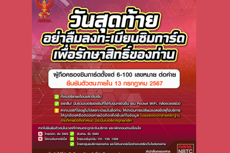 เพจเฟซบุ๊ก กสทช.โพสต์ข้อความ ระบุว่า... วันสุดท้ายของการลงทะเบียนซิมการ์ดเพื่อรักษาสิทธิ์ของท่าน ผู้ถือครองซิมการ์ดตั้งแต่ 6-100 เลขหมายต่อค่าย สามารถยืนยันตัวตนได้วันนี้ (13 กรกฎาคม 2567) วันสุดท้าย นับรวมทั้งเบอร์รายเดือนและเติมเงิน และนับรวมเบอร์ของซิมที่ใช้ทุกอุปกรณ์ เช่น Pocket WiFi, กล้องวงจรปิด