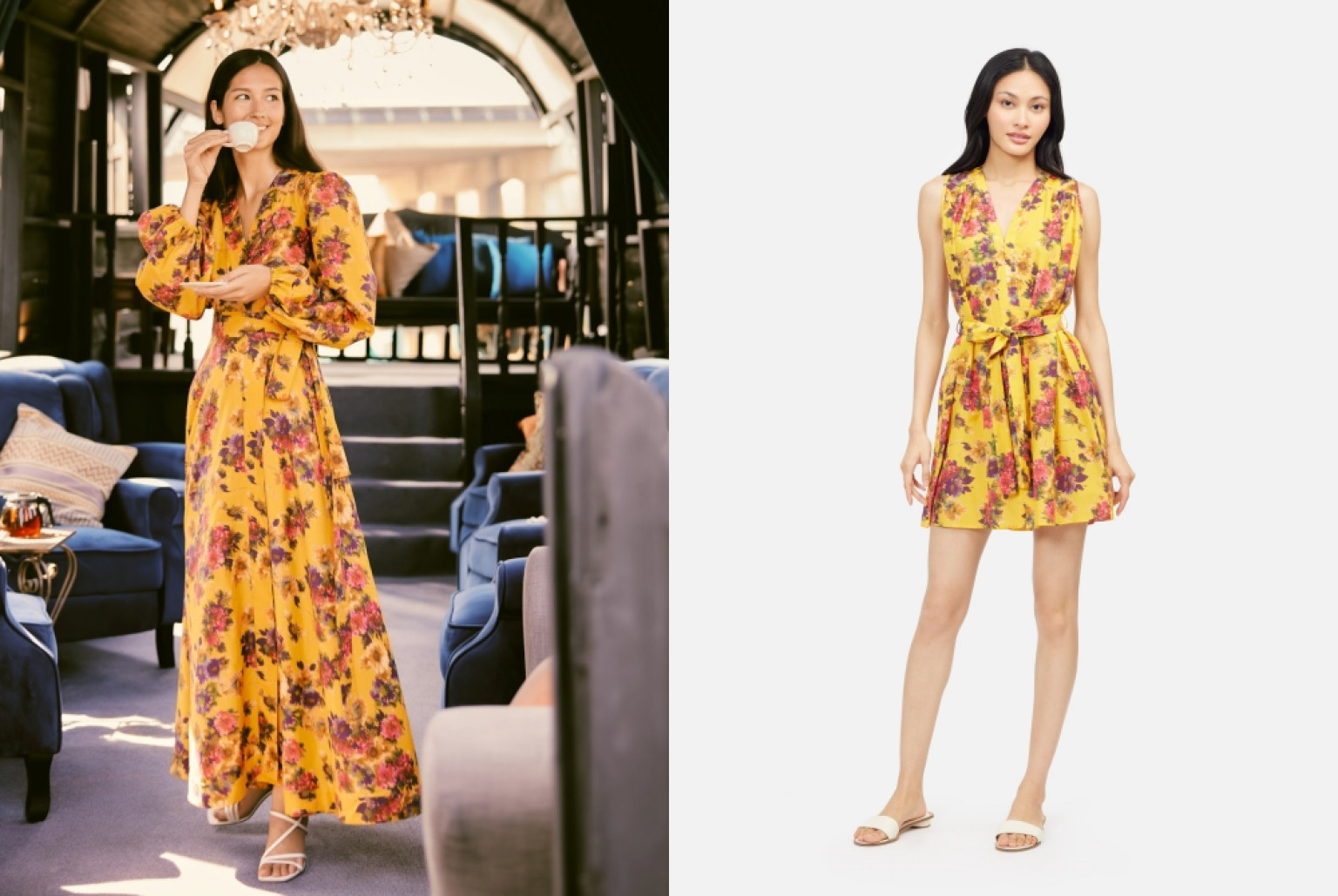 มาถึงลายปรินต์สุดท้ายอย่าง Floral Wrap ลวดลายฟลอรัลดอกไม้สีแดงพิมพ์ลงบนผ้าสีเหลือง มาในหลายไอเทมขายดี อย่างเดรสยาวผูกเอว หรือเดรสสั้นแขนกุดเอาใจสาว ๆ ที่อยากจะคอมพลีตลุคได้ง่ายด้วยไอเทมชิ้นเดียว นอกจากนี้ ไอเทมในลายนี้ยังมีทั้งกระโปรงระบายและเสื้อเบลาส์แขนยาวให้ได้เลือกนำไปมิกซ์แอนด์แมตช์กันอีกด้วย