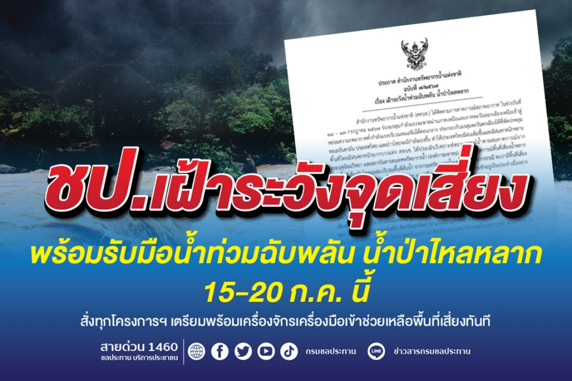 กรมชลประทาน เฝ้าระวังพื้นที่เสี่ยงน้ำท่วมฉับพลัน น้ำป่าไหลหลาก และน้ำล้นตลิ่ง ช่วงวันที่ 15-20 กรกฎาคม 2567 อย่างใกล้ชิด หลังสำนักงานทรัพยากรน้ำแห่งชาติ (สทนช.) ประกาศเตือนมีฝนตกหนักถึงหนักมากบางพื้นที่