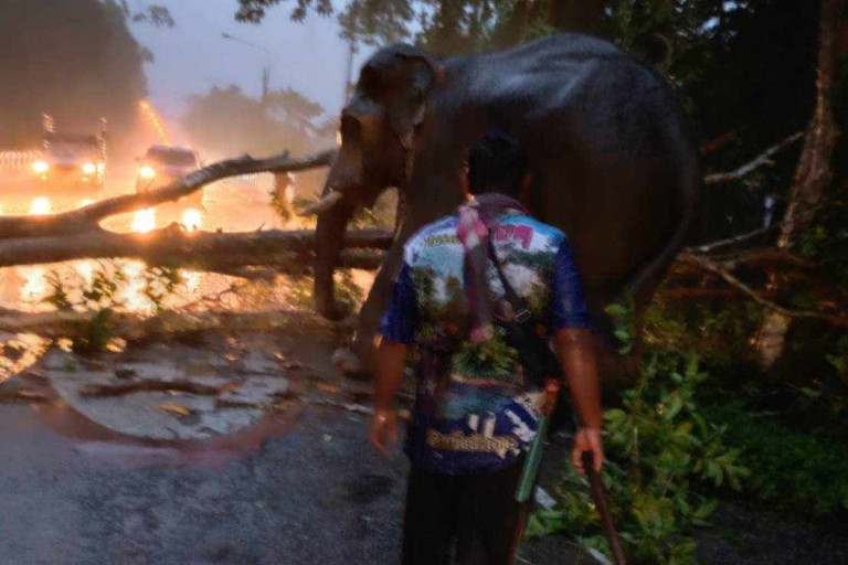 พังงา ชื่นชมช้างพรายน้ำเพชรฝ่าสายฝนช่วยดันต้นไม้ขนาดใหญ่จำนวน 2 ต้น ถูกพายุพัดลมขว้างถนนรถไม่สามารถสัญจรได้แต่สุดท้ายใช้ช้างดันต้นไม้ออกจากถนนจนรถสามารถสัญจรได้