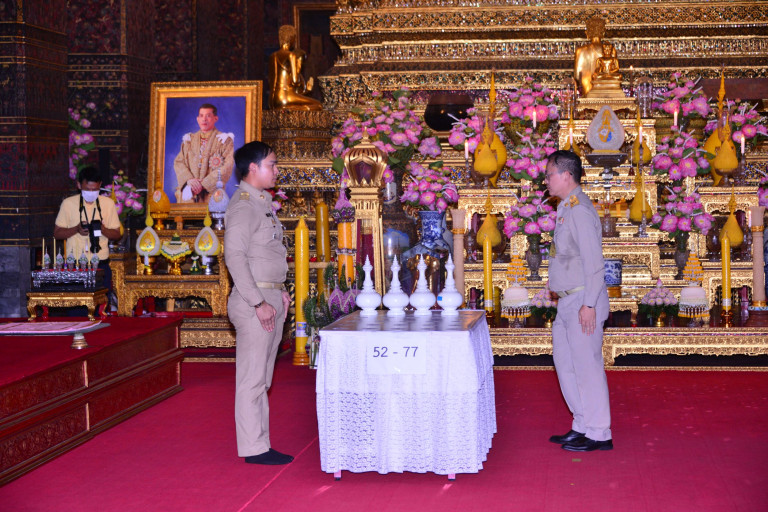 โดยมีผู้แทนนายกรัฐมนตรี ผู้แทนประธานรัฐสภา ผู้แทนประธานศาลฎีกา เชิญพระเต้าปทุมนิมิตทอง นาก เงิน และพานดอกไม้รูปเทียนแพ และผู้บริหารกระทรวงมหาดไทย เข้าประตูวิเศษไชยศรี ผ่านประตูพิมานไชยศรี ไปยังพระที่นั่งอมรินทรวินิจฉัย ผ่านพระทวารกลาง ไปยังหน้าพระวิสูตร จากนั้น ผู้แทนนายกรัฐมนตรี ผู้แทนประธานรัฐสภา ผู้แทนประธานศาลฎีกา เชิญพระเต้าปทุมนิมิตทอง นาก เงิน มอบให้เจ้าพนักงานภูษามาลา สำนักพระราชวัง เพื่อเชิญไปวางบนพระแท่นบัว หน้าพระวิสูตร ผู้แทนนายกรัฐมนตรี ผู้แทนประธานรัฐสภา ผู้แทนประธานศาลฎีกา เชิญพานดอกไม้ ธูปเทียนแพไปวางที่เสาบัวกลุ่ม ตามลำดับ จากนั้น ผู้ว่าราชการจังหวัดทุกจังหวัด และผู้ว่าราชการกรุงเทพมหานคร ฝึกซ้อมการถวายราชสักการะหน้าพระบรมฉายาลักษณ์พระบาทสมเด็จพระเจ้าอยู่หัว เป็นอันเสร็จขั้นตอนการฝึกซ้อม" นายสุทธิพงษ์ กล่าวเพิ่มเติม