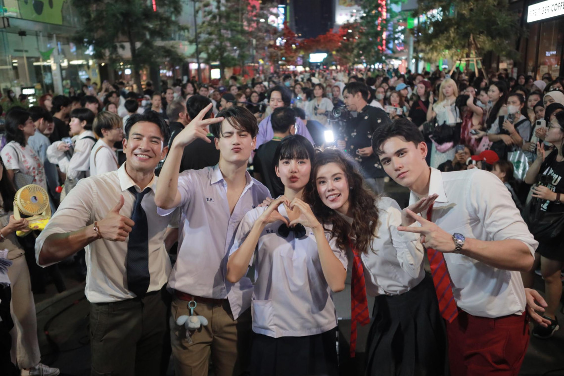งานนี้แฟนคลับต่างพร้อมใจกันมาให้กำลังใจทีมนักแสดง “โบว์-ไอซ์-เกรท-เทศน์-ลีน่า” กันอย่างคึกคัก ถึงแม้จะมีอุปสรรคในเรื่องของสภาพอากาศ แต่แฟน ๆ ยังคงไม่ย่อท้อยืนรอเจอนักแสดงในดวงใจท่ามกลางสายฝน ก่อนเปิดกิจกรรมเซอร์ไพรส์สุดพิเศษให้แฟน ๆ ด้วยการทักทายและแจกของที่ระลึกเป็นบัตรนักเรียนจากในละครอย่างใกล้ชิด ก่อนจะถึงเวลาโชว์ร้องเพลงอย่างสนุกสนาน กับเพลง โลกของฉันคือเธอ และ ฉันคนนี้ Ost.โลกหมุนรอบเธอ ครั้งแรก! ทำเอาเรียกเสียงกรี๊ดจากแฟน ๆ ดังสนั่นเลยทีเดียว และยังมีเพลง แฟนผมน่ารัก, เพิ่งเข้าใจ Ost.ใจพิสุทธิ์, คำแพง, งอนตลอด และ เผลอรักเราสักที ที่แก๊งนักแสดงทั้งร้องทั้งเต้นโชว์กันเต็มที่ จนเรียกความสนใจจากคนที่เดินผ่านไปผ่านมาต้องหยุดเพื่อถ่ายคลิปเก็บไว้เป็นความประทับใจกันเลยทีเดียว