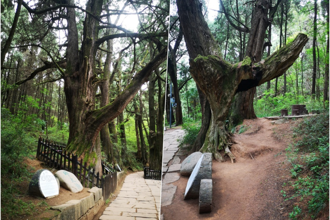 ต้นสนลักษณะประหลาด ลำต้นถูกตัดแหว่งมีรอยไฟไหม้ ตำนานเล่าขานว่าเมื่อจ๊กก๊กล่มสลายกองทัพวุยก๊กสะสางปัญหาภายในและจัดบ้านเมืองหลังจากเตงหงายผู้พิชิตจ๊กก๊กถูกจับข้อหาว่าส่อเจตนาขบถส่วนจงโฮยก่อรัฐประหารไม่สำเร็จแผนเกียงอุยจะกอบกู้ชาติล้มเหลวสิ้นชีวิต