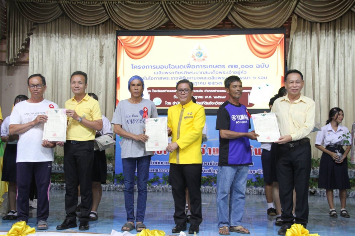 โดย นายสมศักดิ์ แป้นถนอม ปฏิรูปที่ดินจังหวัดสกลนคร กล่าวว่า การมอบโฉนดเพื่อการเกษตรในครั้งนี้ สำนักงานการปฏิรูปที่ดินเพื่อเกษตรกรรม (ส.ป.ก.) ได้จัดทำโครงการมอบโฉนดเพื่อการเกษตรทั่วประเทศ 72,000 ฉบับ เฉลิมพระเกียรติพระบาทสมเด็จพระเจ้าอยู่หัว เนื่องในโอกาสพระราชพิธีมหามงคลเฉลิมพระชนมพรรษา 6 รอบ 28 กรกฎาคม 2567 โดยกำหนดให้ ส.ป.ก.แต่ละจังหวัด เป็นผผุ้ดำเนินการเพื่อเป็นการ แสดงความจงรักภักดี และสำนึกในพระมหากรุณาธิคุณเป็นล้นพ้นอันหาที่สุดมิได้ และเพื่อเป็นการเทิดทูนสถาบันพระมหากษัตริย์ เปิดโอกาสให้กษตรกรได้มีส่วนร่วมในการดำเนินกิจกรรม อันเป็นการสร้างความสามัคคีและขวัญกำลังใจให้กับเกษตรกรในการดำรงไว้ซึ่งแผ่นดินเกษตรกรรม ซึ่งในวันนี้ได้มอบโฉนดเพื่อการเกษตร ให้แก่เกษตรกรอำเภอสว่างแดนดินและอำเภอส่องดาว จำนวน 1,998 ราย 2,452 แปลง เนื้อที่ประมาณ 28.316 ไร่ 1 งาน 77 ตารางวา ซึ่งการมอบโฉนดที่ดินดังกล่าว พร้อมกันหลายจังหวัดทั่วประเทศ โดยมี ร.อ.ธรรมนัส พรหมเผ่า รัฐมนตรีว่าการกระทรวงเกษตรและสหกรณ์ เป็นประธาน ถ้ายทอดสดทักทายกับผู้ได้รับโฉนดที่ดินเพื่อเกษตรกรรม