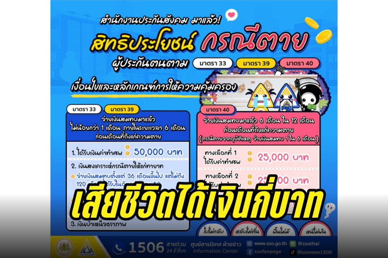 "ประกันสังคม" แจงสิทธิประโยชน์กรณีตายผู้ประกันตน ม.33,39,40 เช็กที่นี่ได้เงินกี่บาท