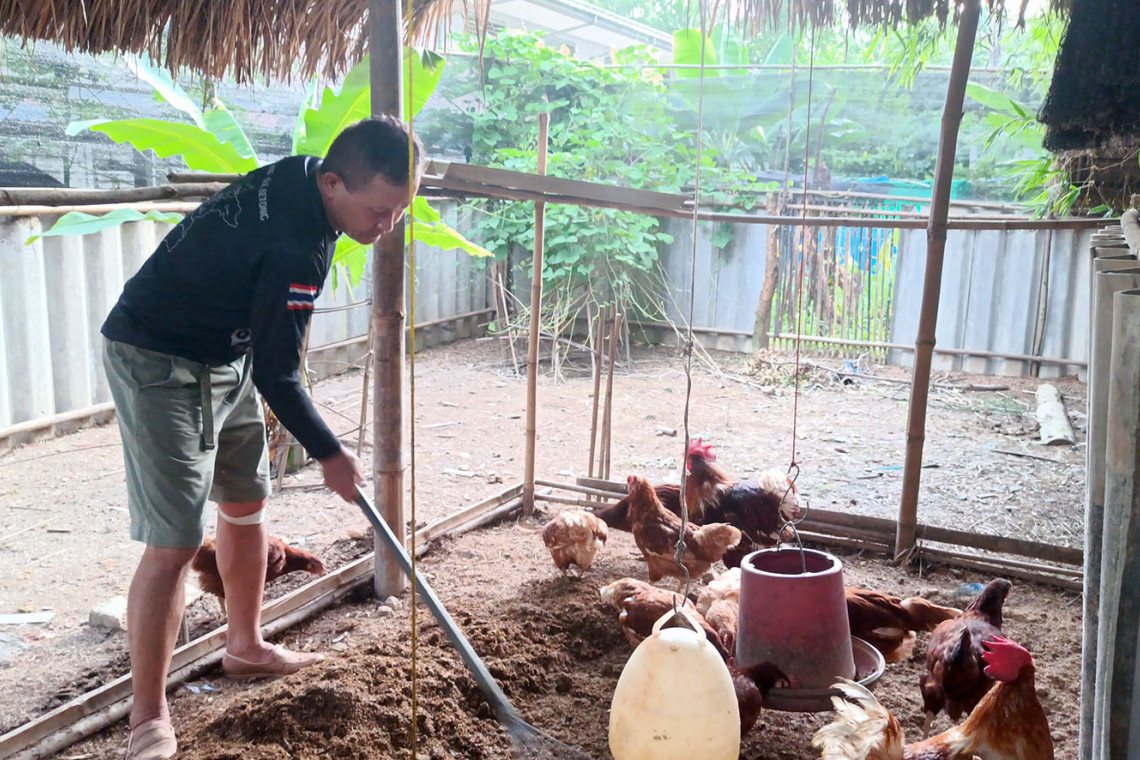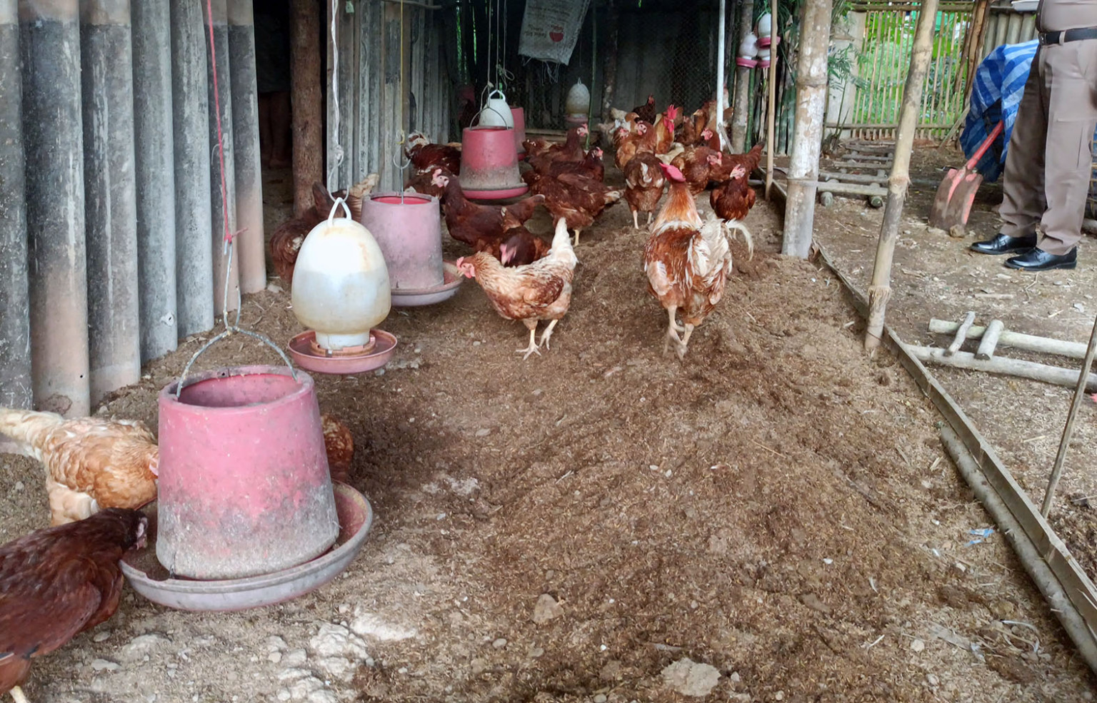ด้าน ร.ต.อ.สมพงษ์ นามศรี รอง สว.สส.สภ.ปากคาด ผู้รับผิดชอบเลี้ยงดูไก่ไข่อารมณ์ดี เล่าให้ฟังพร้อมกับกวาดขี้ไก่ทำความสะอาดโรงเรือนและที่ผสมแกลบกรอกใส่ถุงปุ๋ยเพื่อขายให้ชาวสวนยางพารา สวนผลไม้และซื้อไปเป็นอาหารปลานิลในราคากระสอบละ 50 บาทขายดีด้วย มีคนมาซื้อและจองไว้ตลอด นับว่าเป็นรายได้อีกทางด้วย ส่วนอาหารไก่อารมณ์ดีไม่ได้เลี้ยงด้วยหัวอาหารอย่างเดียว แต่จะนำหยวกและต้นกล้วยมาสับๆ ผสมกับผัก รำข้าว และเถาบอระเพ็ดเพื่อสร้างภูมิคุ้มกันให้ไก่แข็งแรง จากนั้นคลุกผสมเข้าด้วยกัน นำไปให้ไก่กิน เป็นการประหยัดค่าอาหารไก่ และก็ปล่อยให้หากินเองตามธรรมชาติด้วย ตอนเย็นก่อนเข้าเรือนนอนก็ให้อาหารอีกรอบ เพราะถ้าไก่ไม่อิ่มท้องก็จะไม่ยอมเข้านอน เมื่อเข้าอยู่ในโรงเรือนก็เป็นเพลงเบาๆ ให้ไก่ฟังตลอดทั้งวัน จึงเรียกได้ว่าเลี้ยงไก่อารมณ์ดีและจะออกไข่ให้ผลผลิตดีนั่นเอง